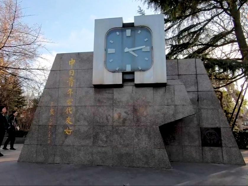 中日友好钟座位于松竹梅区北部,于1984年为庆祝中日青年友好大联欢而建。钟座上有王震同志的亲笔题词 “中日青年世代友好”。钟座的正面对着开阔的湖面,可远眺公园风景游览区的主要景色。北面与东面是草坪,背后是由植物组成的绿色背景,环境意境与景点表现的主题融为一体。