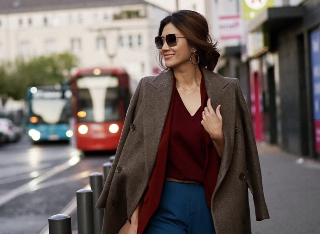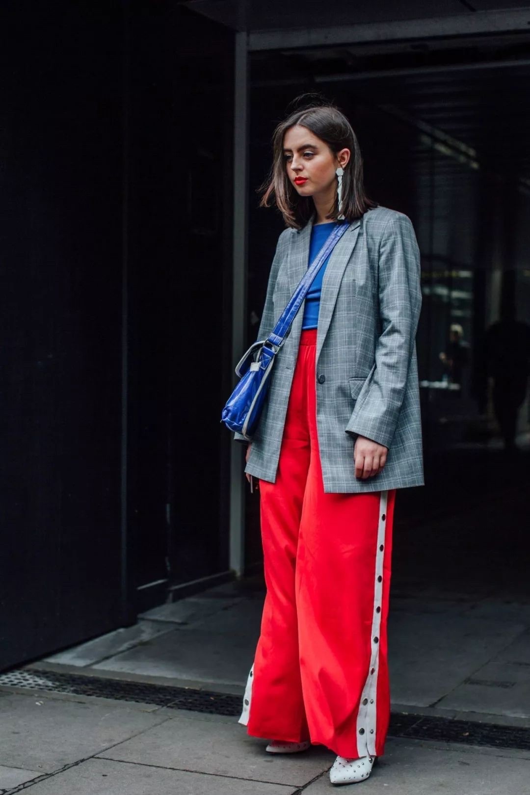 在秋冬季节,灰色外套搭配一件红色的内搭,展现出温暖感的同时,又能为整体造型增添一抹高级质感。
