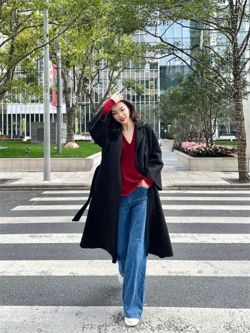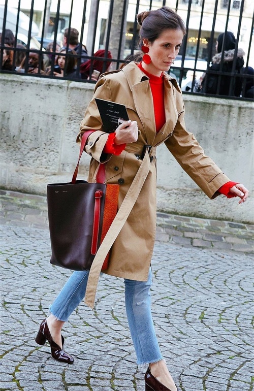 尤其是当驼色外套与红色内搭碰撞在一起时,它们之间会产生一种独特的色彩碰撞。红色内搭的鲜艳与活力,与驼色的温暖和中性完美结合,使得整体造型既抢眼又不失优雅。