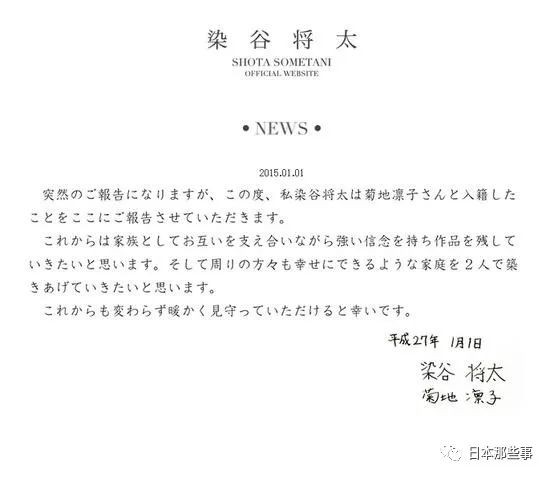 2015年1月1日,23岁的染谷将太在个人官网发表声明,他已经和演员菊地凛子结为夫妻,并称“今后我们两人会以家人的身分互相扶持,并抱持着强烈的信念带来更多的作品,也希望能够共筑让旁人都能感到幸福的家庭。”2016年,24岁的染谷将太升级当爸。