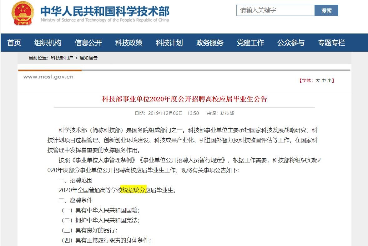 科技部2020事业单位招聘公告去掉“全日制”要求