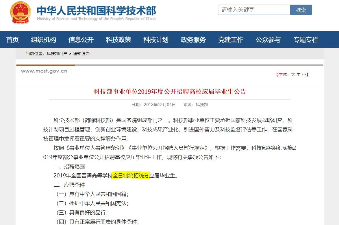 科技部2019年事业单位公告强调全日制学历