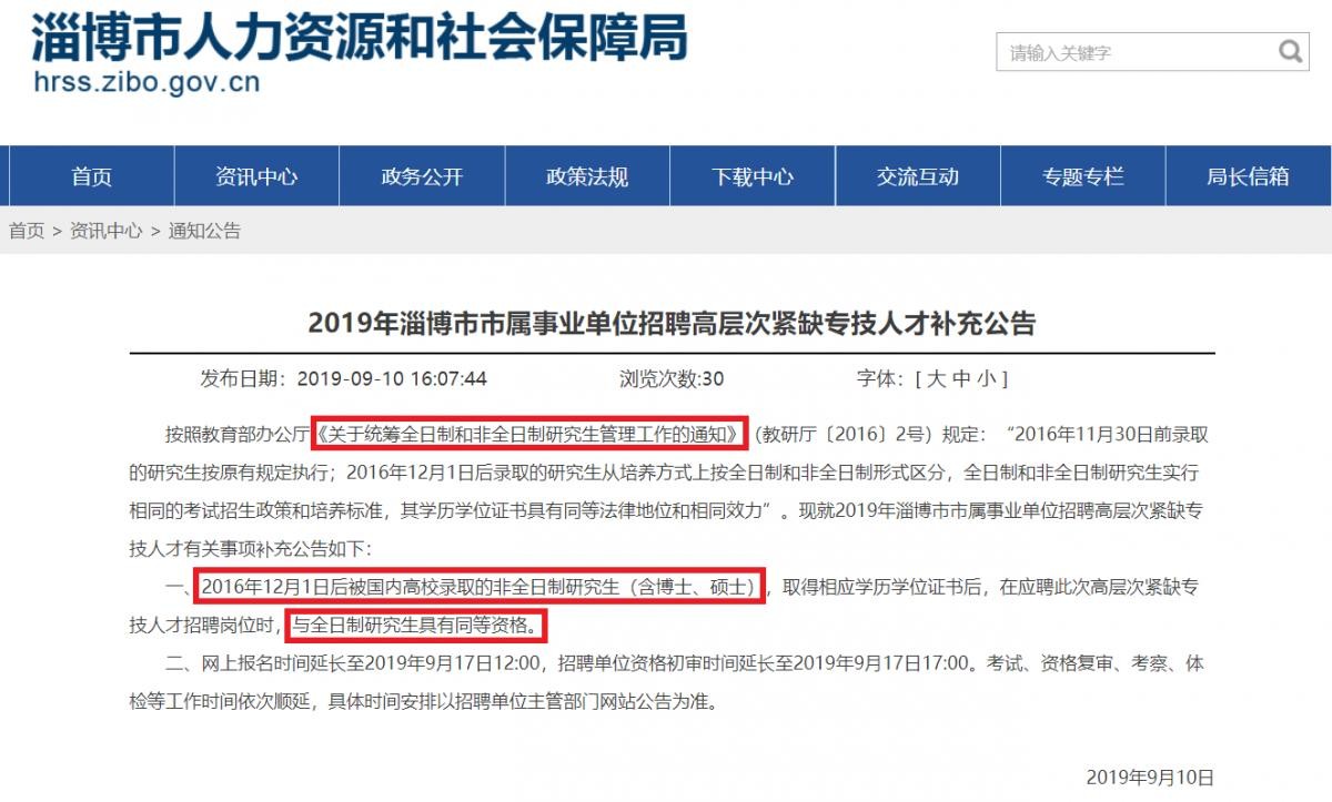 淄博市事业单位招聘补充公告专门说明非全日制与全日制具有同等资格