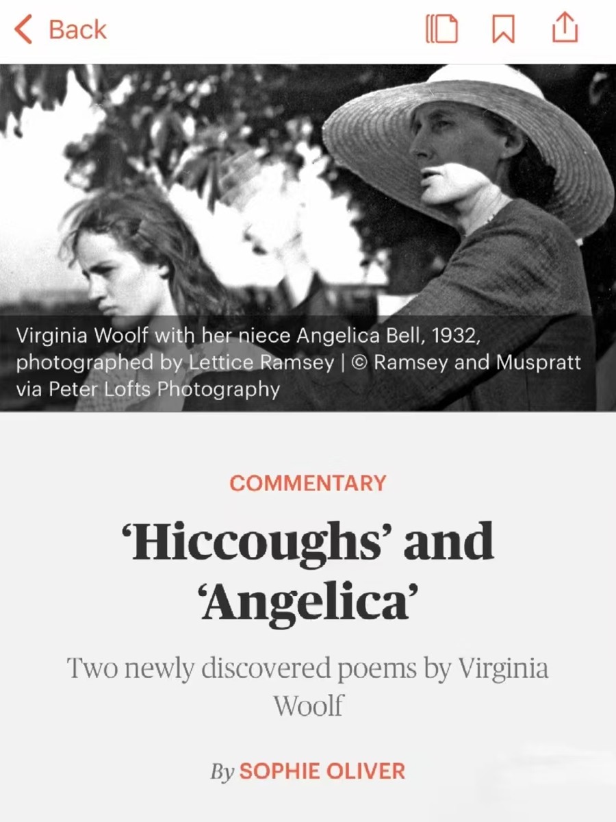 ▷伍尔夫最新发现两首诗歌。《泰晤士报文学增刊》近日发布了一篇文章,刊载了两篇弗吉尼亚·伍尔夫的新诗歌,诗歌名为Angelica和Hiccoughs。