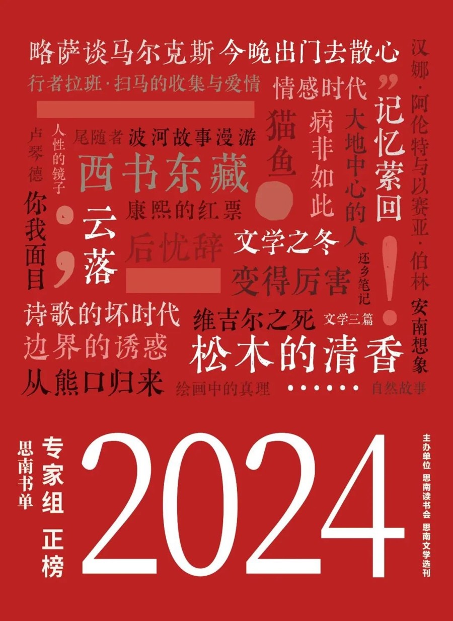▷“思南书单2024”发布。30部作品组成“专家组正榜”。该榜分为“年度长篇小说”“年度小说集”“年度诗集”“年度非虚构”“年度人文社科(专著类)”“年度人文社科(随笔类)”6大类,每个类别下包括3部原创作品和2部翻译作品。此外,同步发布的还有“专家评委个人推荐榜”“跨界组推荐榜”和“读者组推荐榜”。