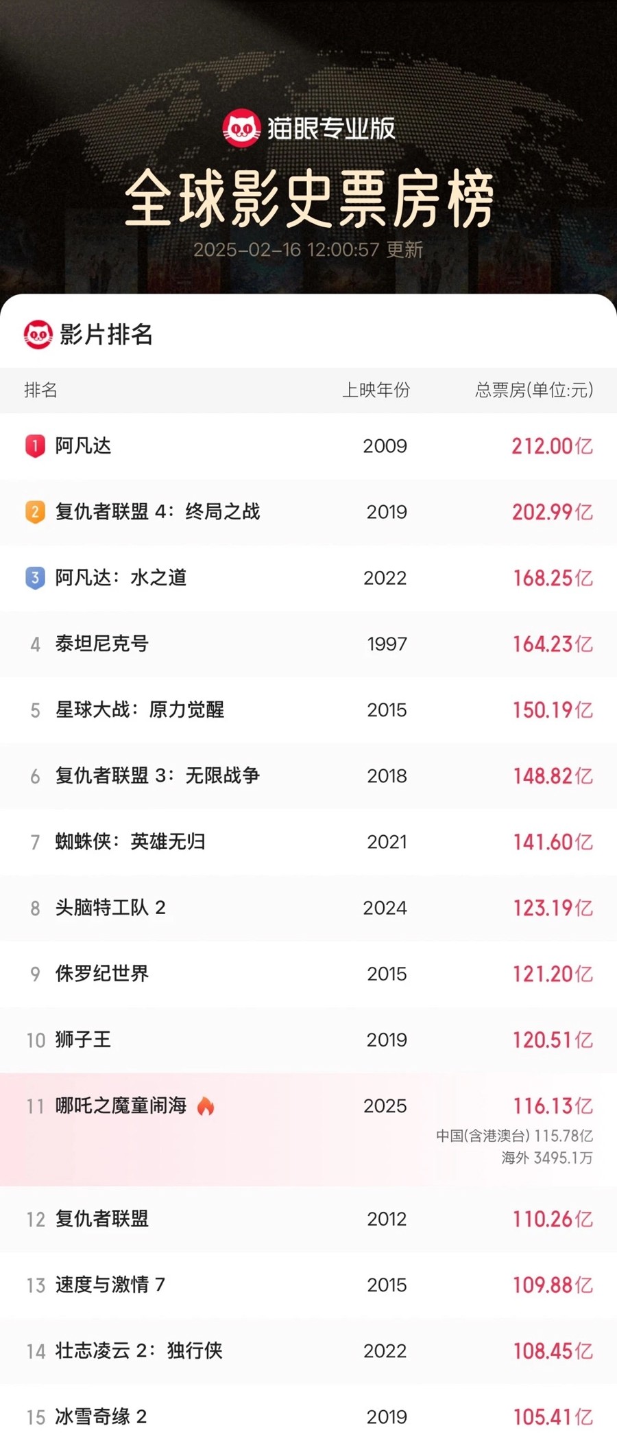 ▷电影《哪吒之魔童闹海》票房突破百亿,导演饺子成为中国影史最高票房导演。截止2月16日,《哪吒之魔童闹海》电影总票房已超116亿元,成为首部进入全球电影票房前11位的亚洲电影,有望进入全球票房前十位。此外,中信出版社携手电影主创团队近日推出官方番外绘本《哪吒·三界往事》,书中记录了主创团队五年多的创作点滴,大量呈现电影中的艺术设计,讲述了电影诞生的幕后故事。