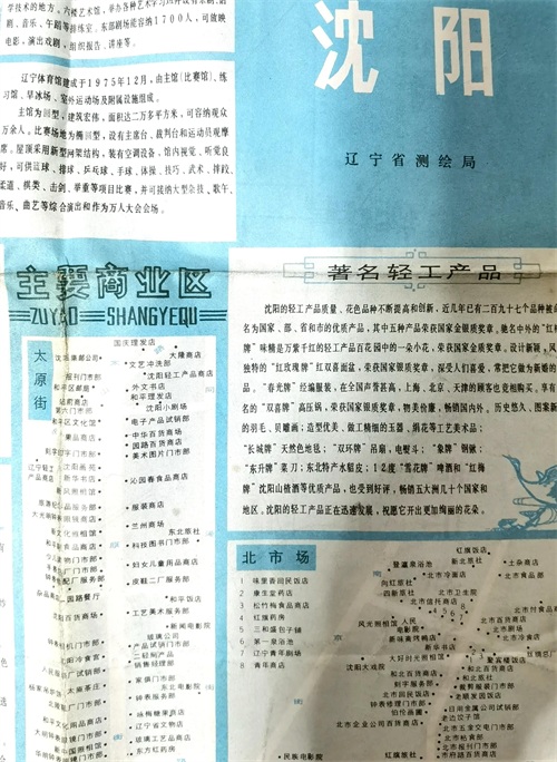 当时,辽宁体育馆(大馆)还在辽宁工业展览馆北面,沈阳建筑大学叫沈阳建筑工程学院,东北大学叫东北工学院,医大盛京医院叫医大三院,南京南街叫南京街等。太原街、中街等商业街的繁华东北有名。