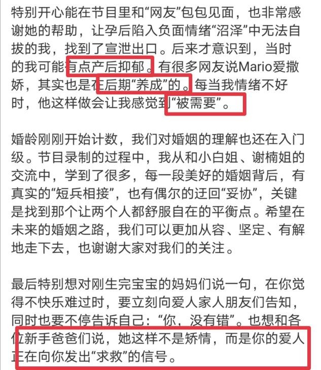 奚梦瑶先表示在节目中两人的相处模样都是"最真实的我们",她谈到自己的婚后生活,自曝生下小孩后"有点产后抑郁",因此在节目中丈夫爱撒娇也是为了让她"感觉到被需要",而这一性格也是他"后期养成"的,最后,奚梦瑶还呼吁新手爸爸们多关心爱人"产后抑郁"的问题。