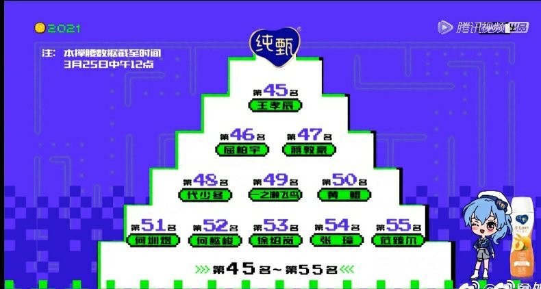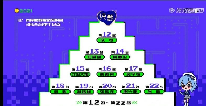 3月27日,《创造营》公布Top11:刘宇、周柯宇、力丸、赞多、林墨、米卡、伯远、尹浩宇、甘望星、张嘉元、奥斯卡。刘宇稳坐第一,周柯宇第二,伯远和甘望星上升至出道位。