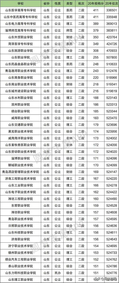 以下是根据山东省教育考试院公布的2020年招录情况,整理出的山东省各专科院校的投档分及位次。可以得知:山东2020年投档分数最高的学校是山东医学高等专科学校和山东中医药高等专科学校,这两所院校的投档分均为411分,其中山东医学高等专科学校最低投档位次为336501,山东中医药高等专科学校最低投档位次为335948。