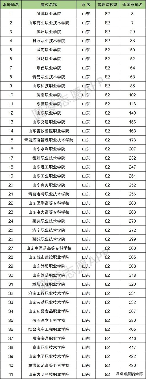 根据2021年金苹果排行榜——2021-2022年山东高职院校排名(共41所)来看,省内排名第一位的是淄博职业学院,全国排名第三位。紧随其后的的山东商业职业技术学院,省内排第二,全国排第七位。以下为具体排名:
