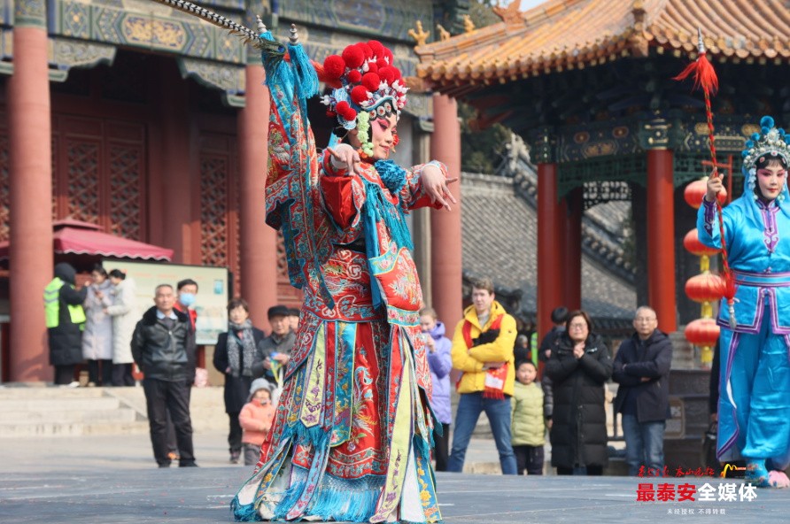 旋转、跳跃、托举……在天贶殿前,圣彼得堡国立柴可夫斯基芭蕾舞团的演员们佩戴着泰山景区赠送的象征平安吉祥的红围巾,为现场的游客带来了芭蕾舞节目《雪景慢板舞》表演,吸引了不少游客驻足。山东梆子艺术研究院紧随其后,献上独具魅力的山东梆子戏《十一国》,铿锵的鼓点和精彩到位的表演引得现场观众不时发出阵阵惊叹和掌声,并拿出手机记录下这些精彩的瞬间。