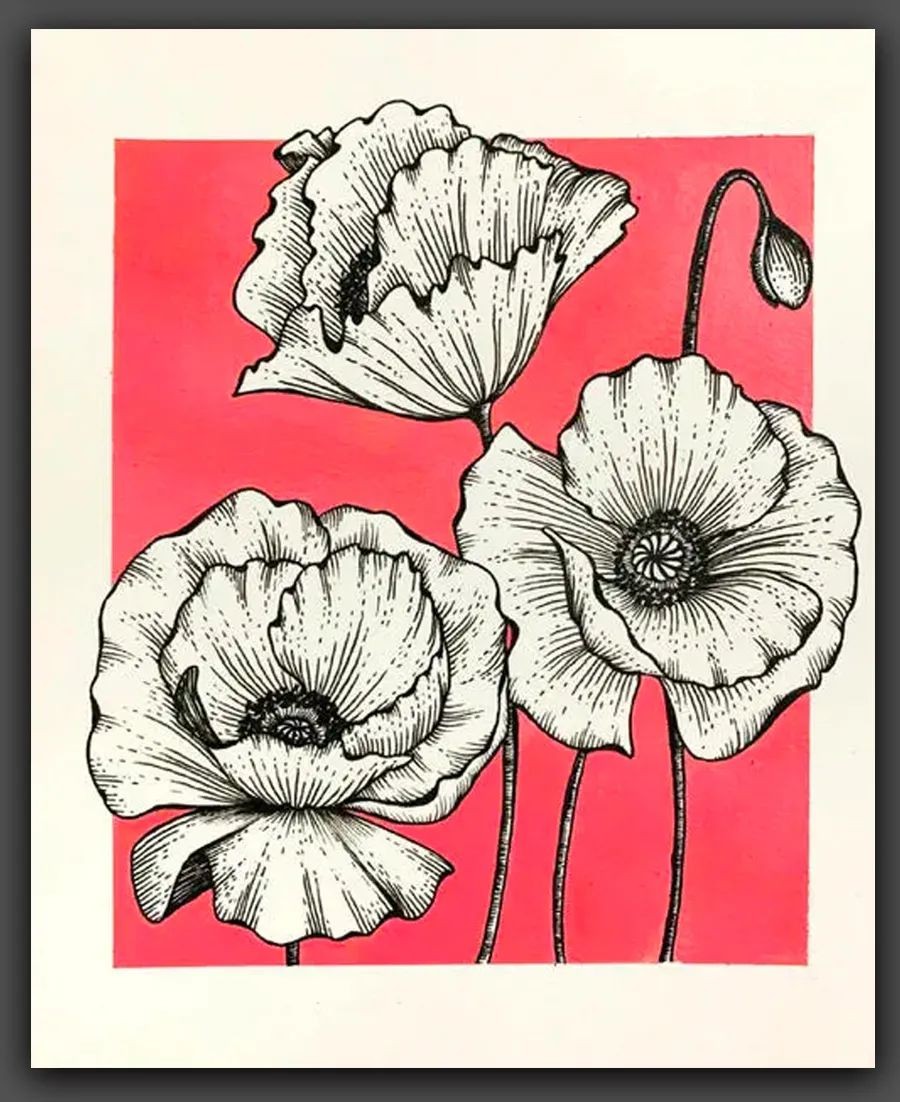 当然,在这组线描花卉作品中富有创意的是,在背景的表现上,仅仅用到简单、平整的色块,加以点缀和烘托,鲜艳的几何色块将主体花朵衬托得更加鲜明,同时 也多了一份特别的味道,给人以独特的、美的享受。
