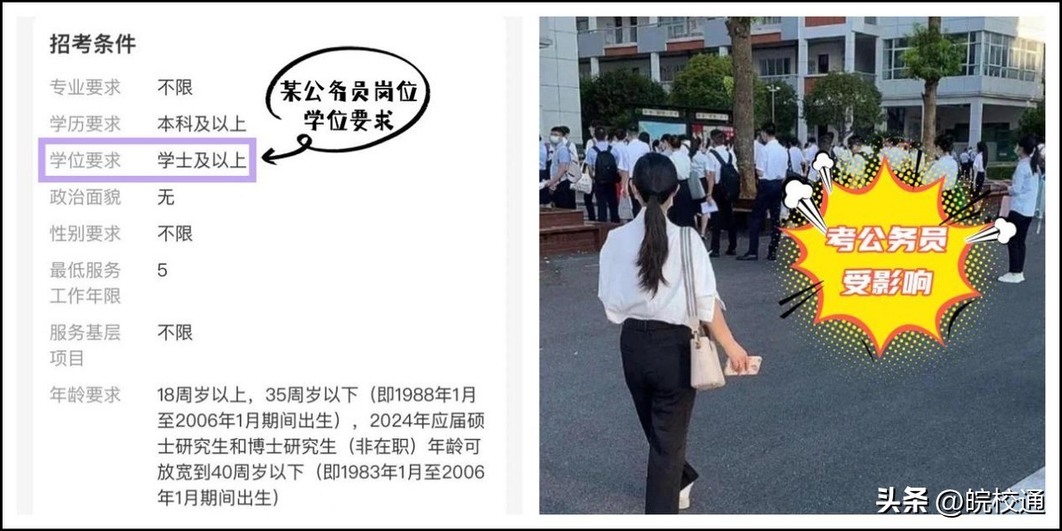 许多公务员的岗位明确要求报考者需要具备本科学位证。如果没有本科学位证,有些岗位报考就会受到限制导致报不了,特别是管理岗或者专业技术岗位,基本上都要求考生具有学士学位,如果没有学位证,就会失去这些岗位考试机会。