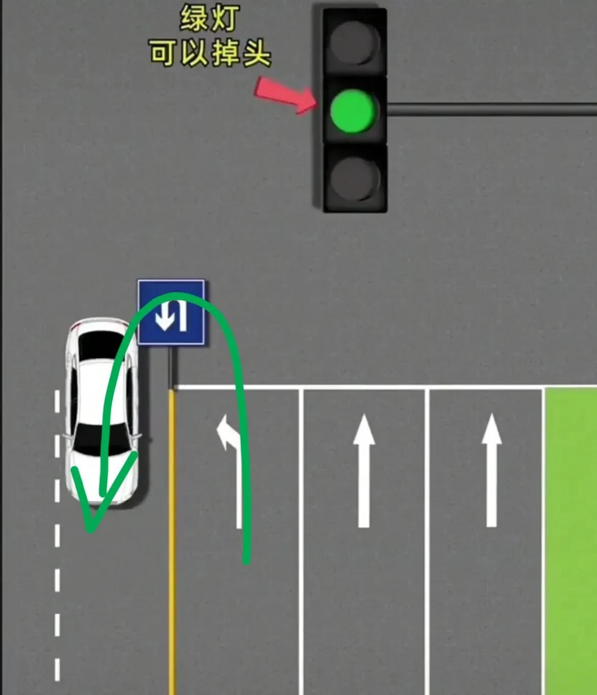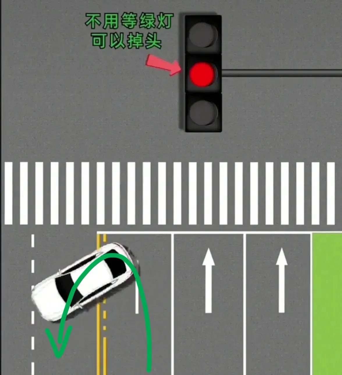 这种情况下,绿灯时都可以直接掉头。无掉头标志的路口,注意不要压黄实线就可以掉头。