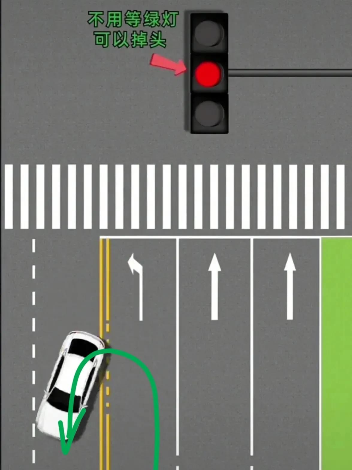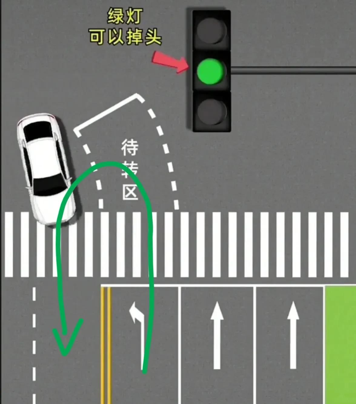 这种情况下,绿灯时也都可以直接掉头。有待转区的路口,注意,这个要过斑马线礼让行人掉头。
