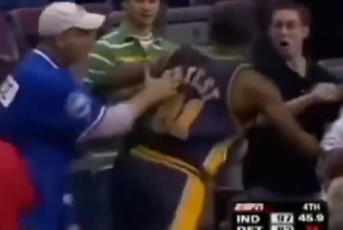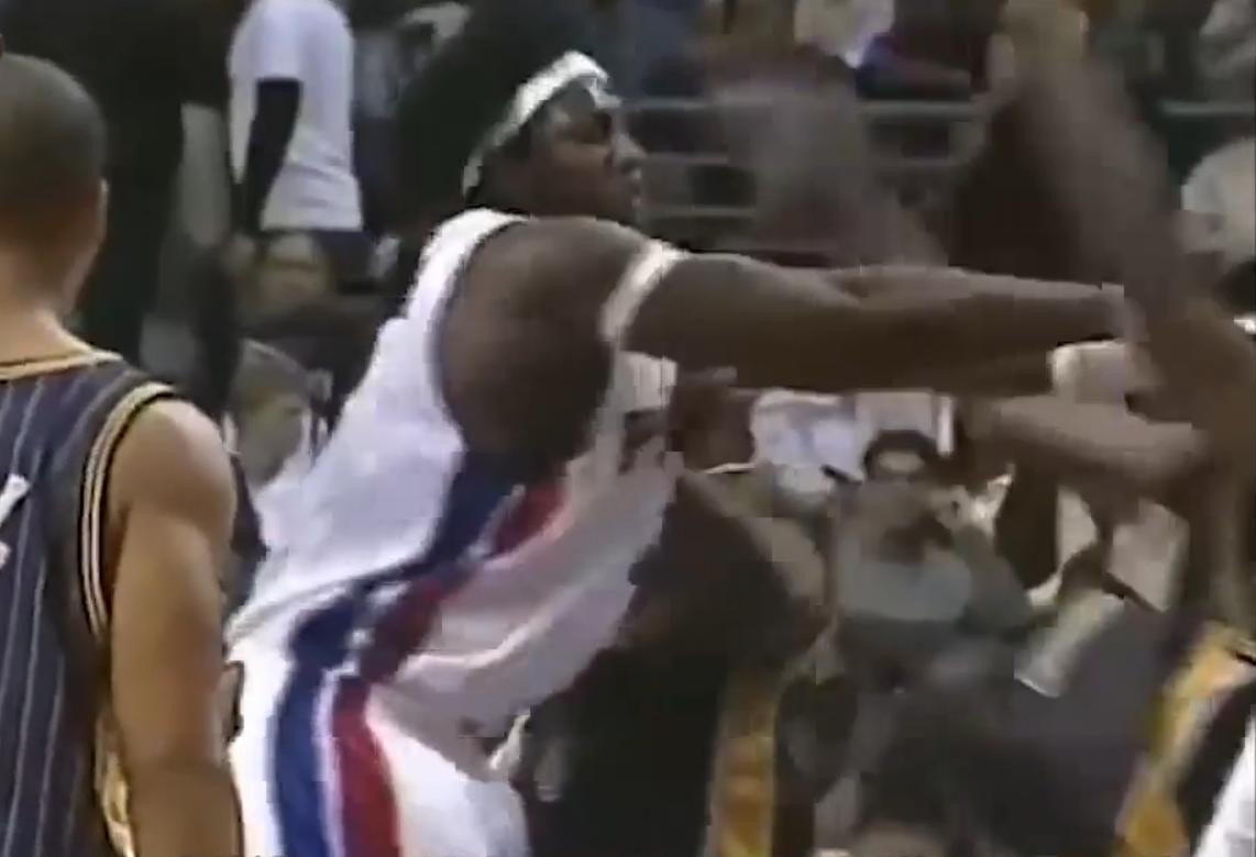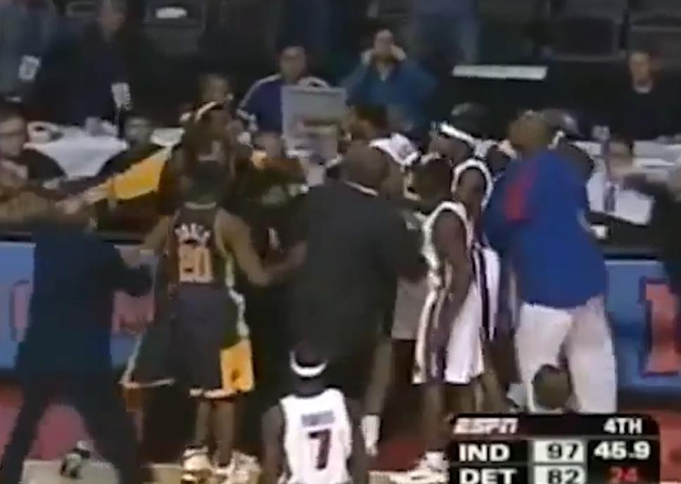 而这场比赛在进行到离全场比赛结束还剩45秒时,步行者大比分领先活塞队,马上要在活塞队的主场拿下一场大胜,按理说比赛已经进入了垃圾时间。但步行者队的火药桶阿泰斯特和活塞的全明星队员华莱士仍在场上,这时阿泰斯特的一个凶狠且没必要的犯规激怒了华莱士。