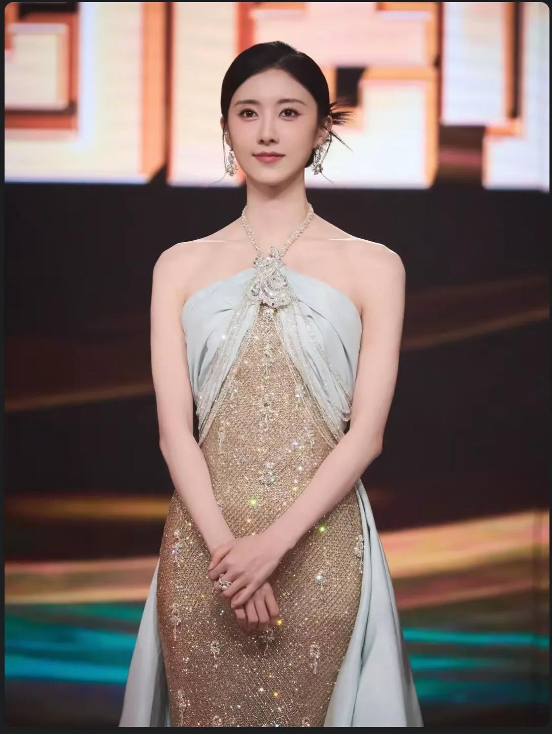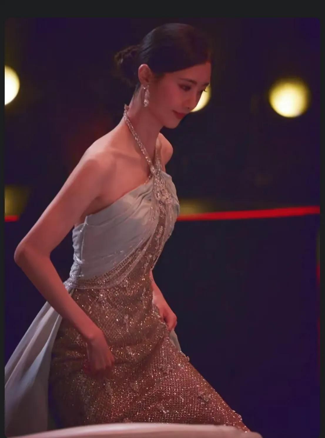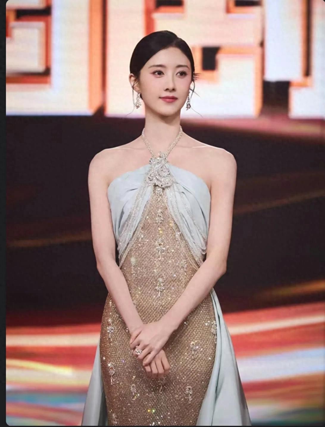 盛典之夜,曹斐然身着一袭灰粉色纱质抹胸长裙,优雅而华丽。裙摆轻扬,勾勒出她曼妙的身姿,抹胸设计则完美展现了她的锁骨与肩颈线条,更添几分性感与妩媚。精致的妆容、自信的微笑,每一个细节都透露出她内在的坚定与从容。她仿佛是从童话中走出的公主,又似现代都市中的独立女性,完美融合了古典与现代之美。