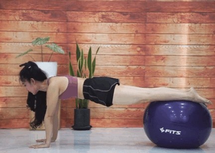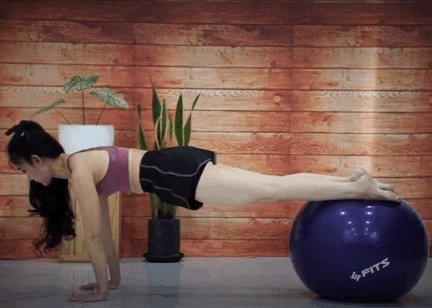双手撑地,双肩垂直于手腕将双小腿前侧、脚背压在瑜伽球上注意启动核心,停留1分钟
