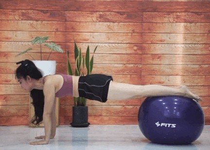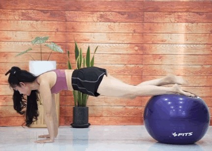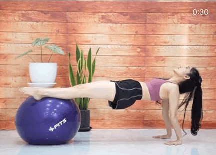 保持上一动作的基础上呼气,收紧核心,臀部向后向上用脚背的力量把瑜伽球向前带吸气,还原,重复练习10-15次