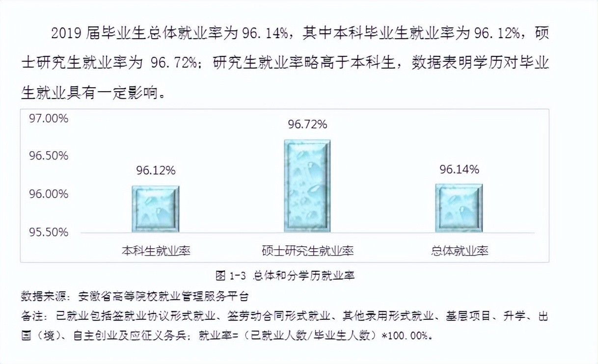安徽工程大学本科就业率为96.12%,硕士就业率为96.72%。