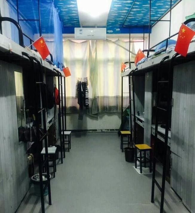 老校区是六人寝,有的宿舍有地砖有的宿舍是水泥地,上床下桌,无独立卫生间,有空调,有风扇,但是学校有大澡堂,和每栋宿舍都是有带独立空间的洗澡间,学校的图书馆很大很漂亮,有五个食堂。