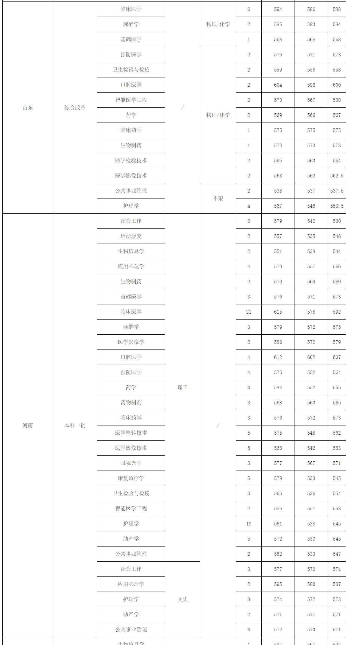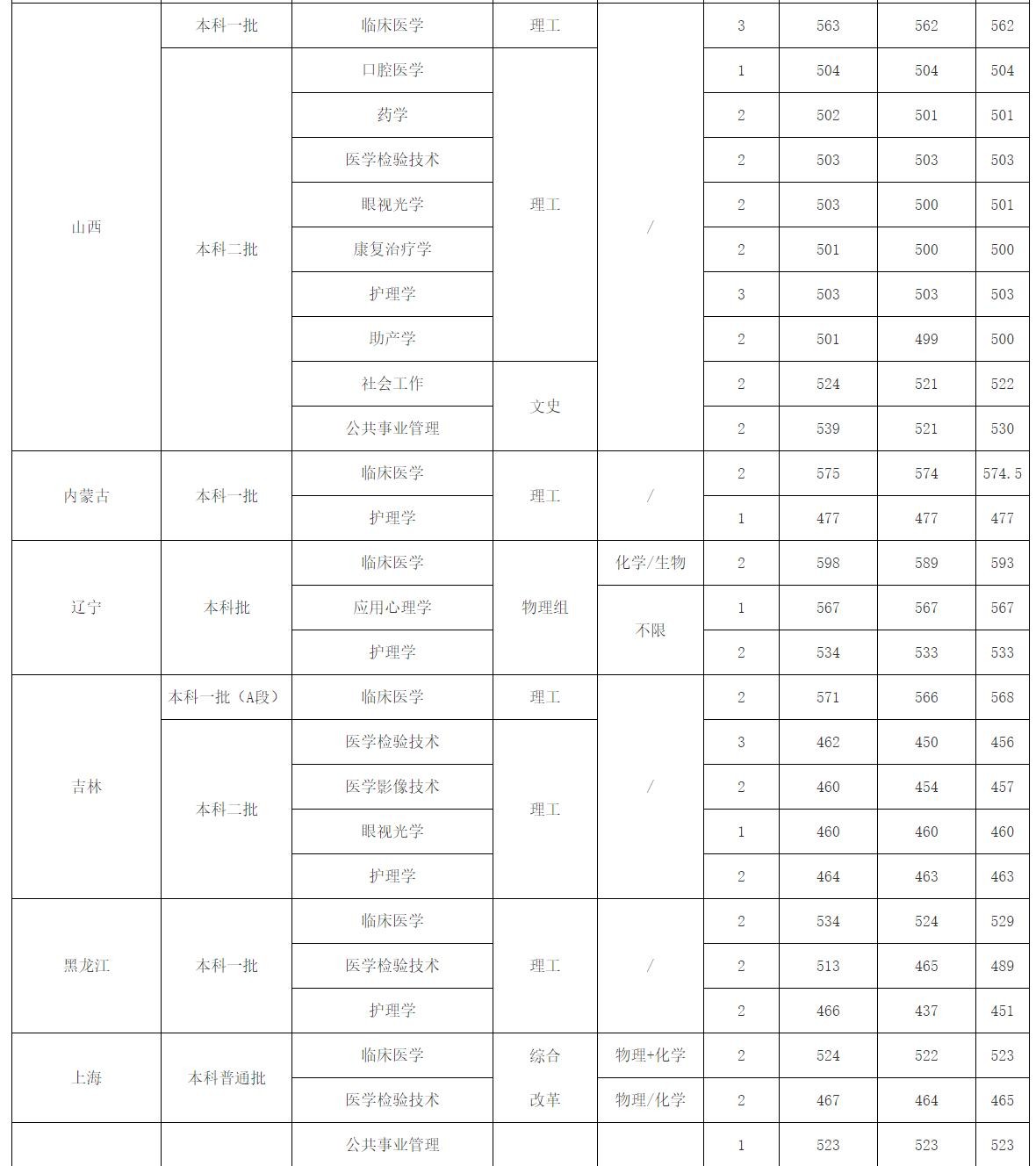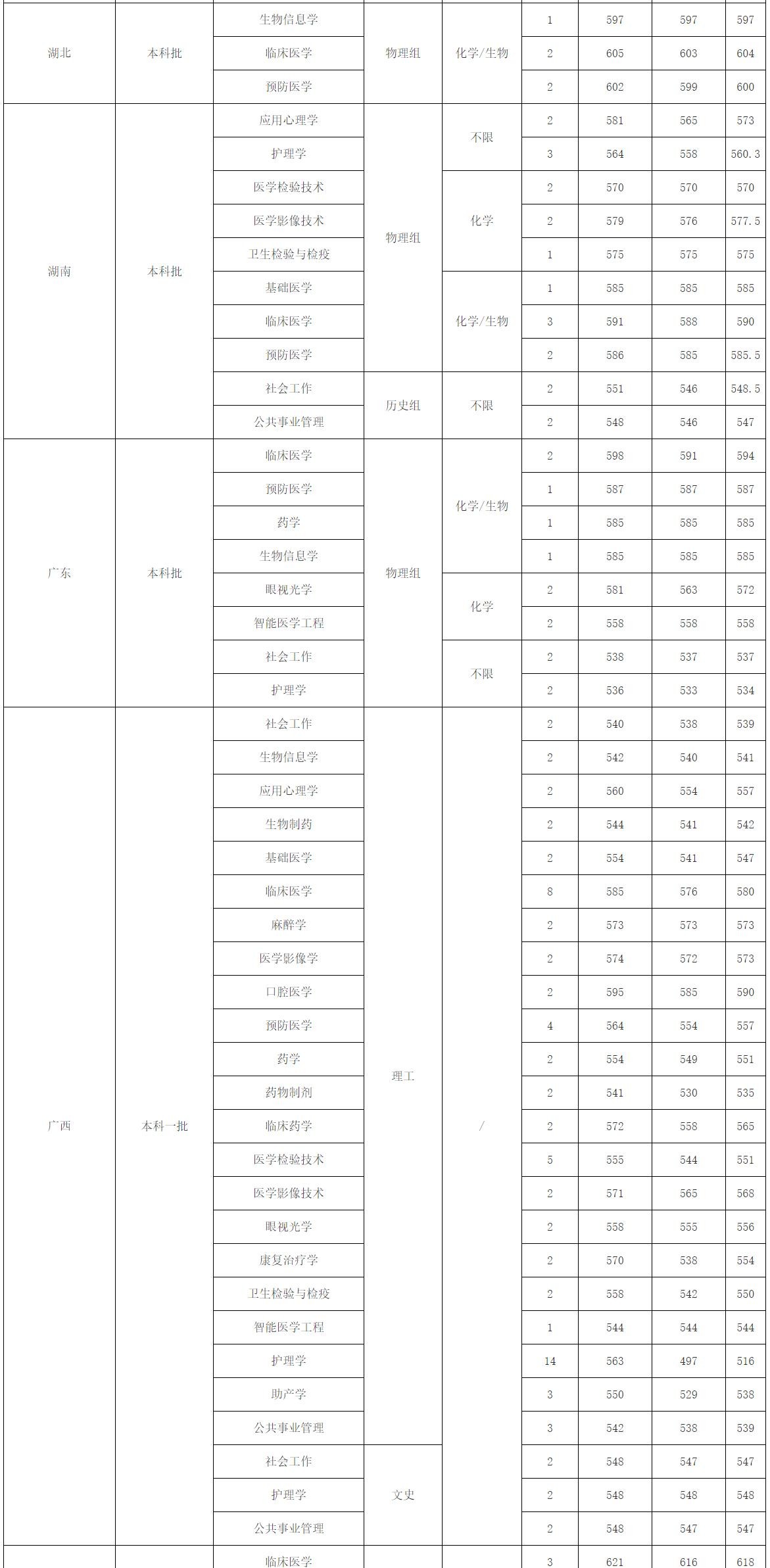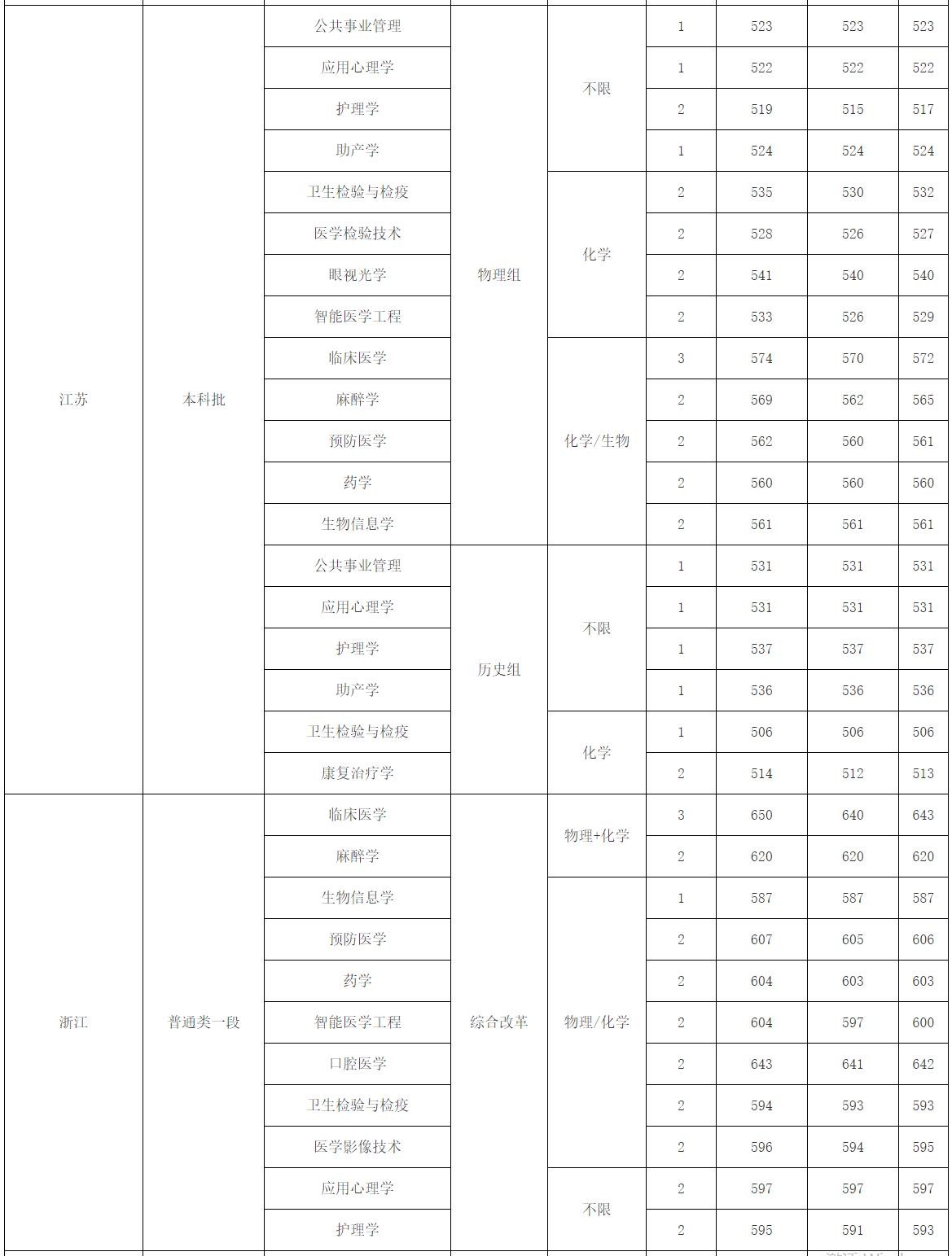 物理类:普通批次:临床医学(5+3一体化)专业的录取分数线最高,录取最低分为614分。护理学专业的录取分数线最低,录取最低分为527分;地方专项计划:麻醉学和医学影像学专业的录取分数线最高,录取最低分为577分。卫生检验与检疫专业的录取分数线最低,录取最低分为439分。
