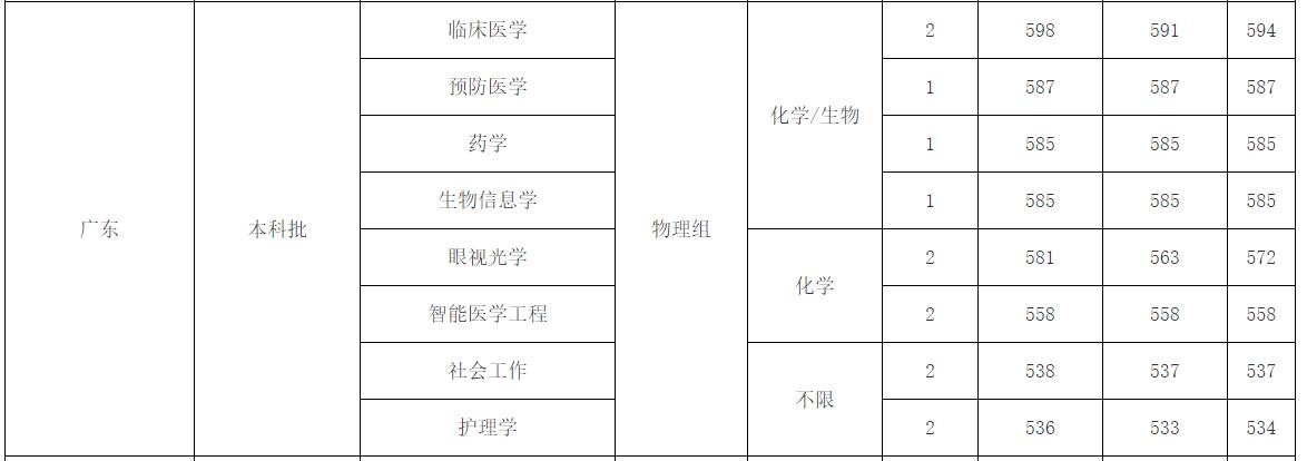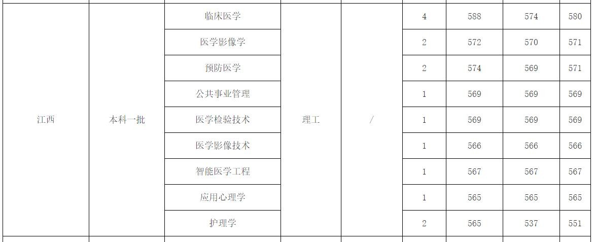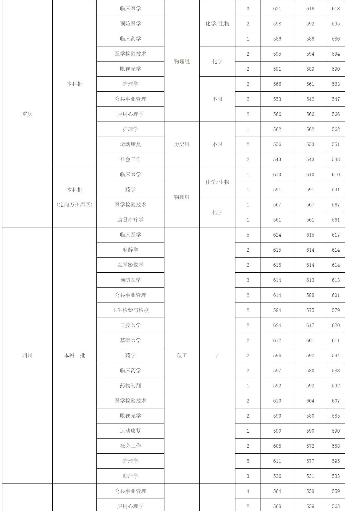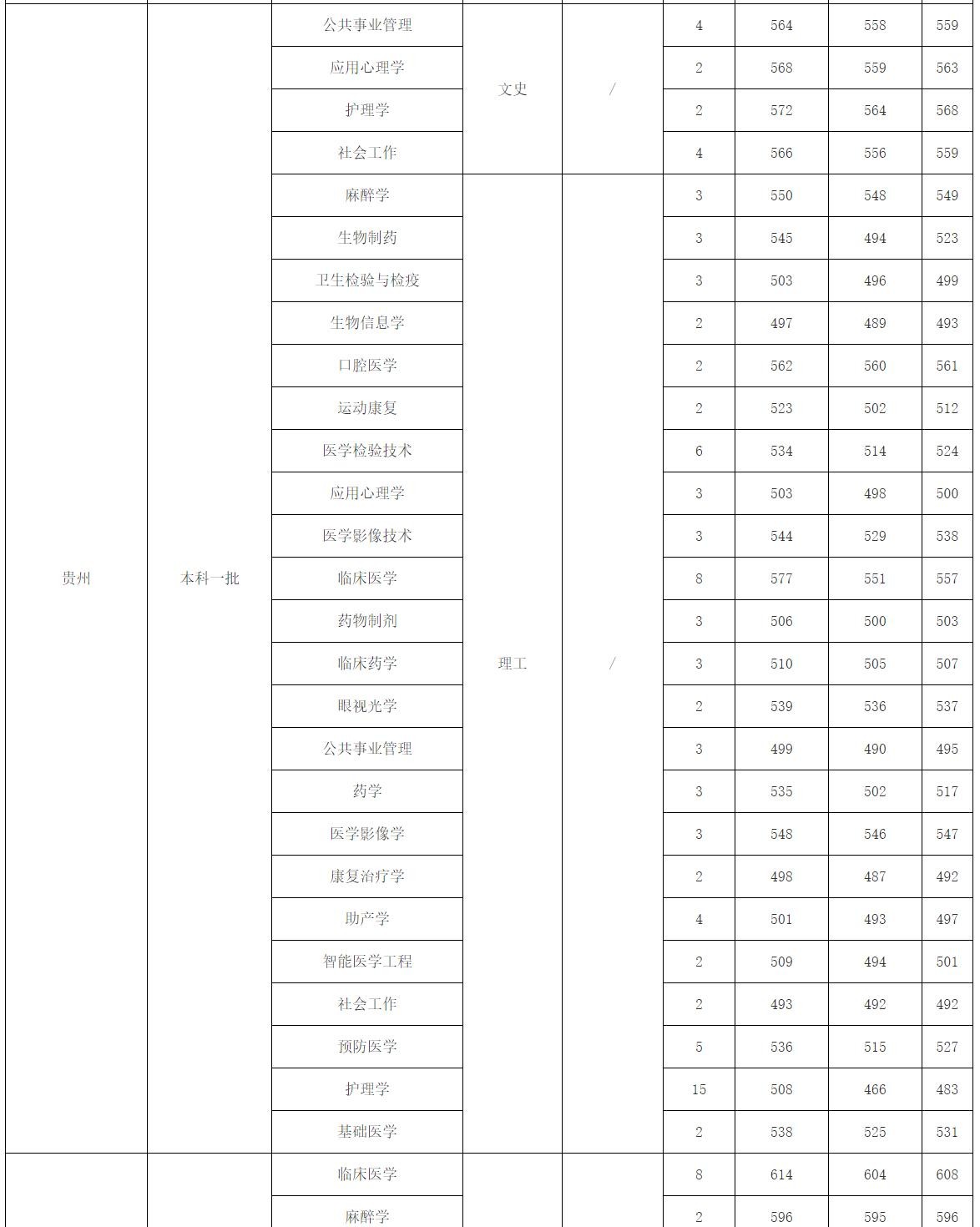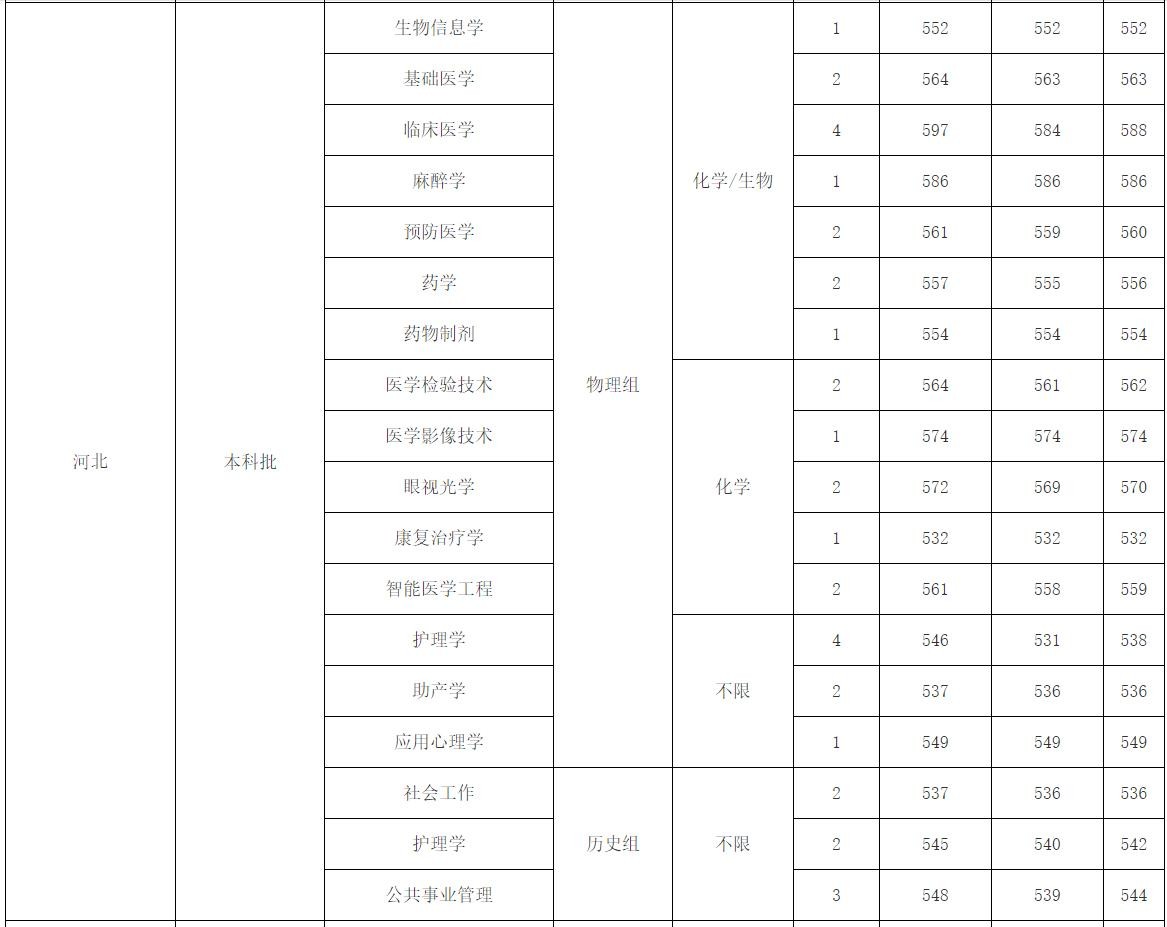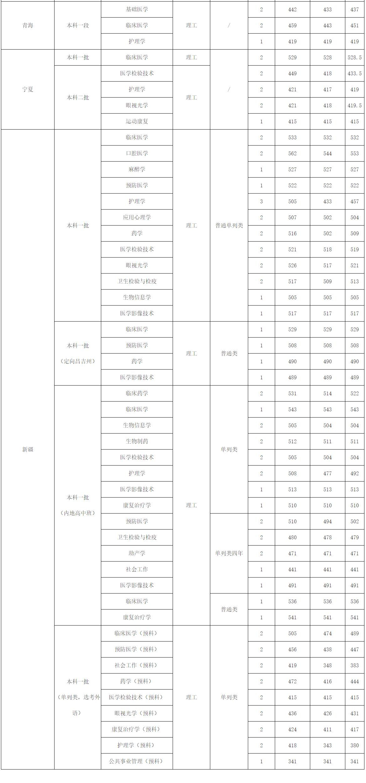 物理类:普通批次:临床医学(5+3一体化)专业的录取分数线最高,录取最低分为614分。护理学专业的录取分数线最低,录取最低分为527分;地方专项计划:麻醉学和医学影像学专业的录取分数线最高,录取最低分为577分。卫生检验与检疫专业的录取分数线最低,录取最低分为439分。