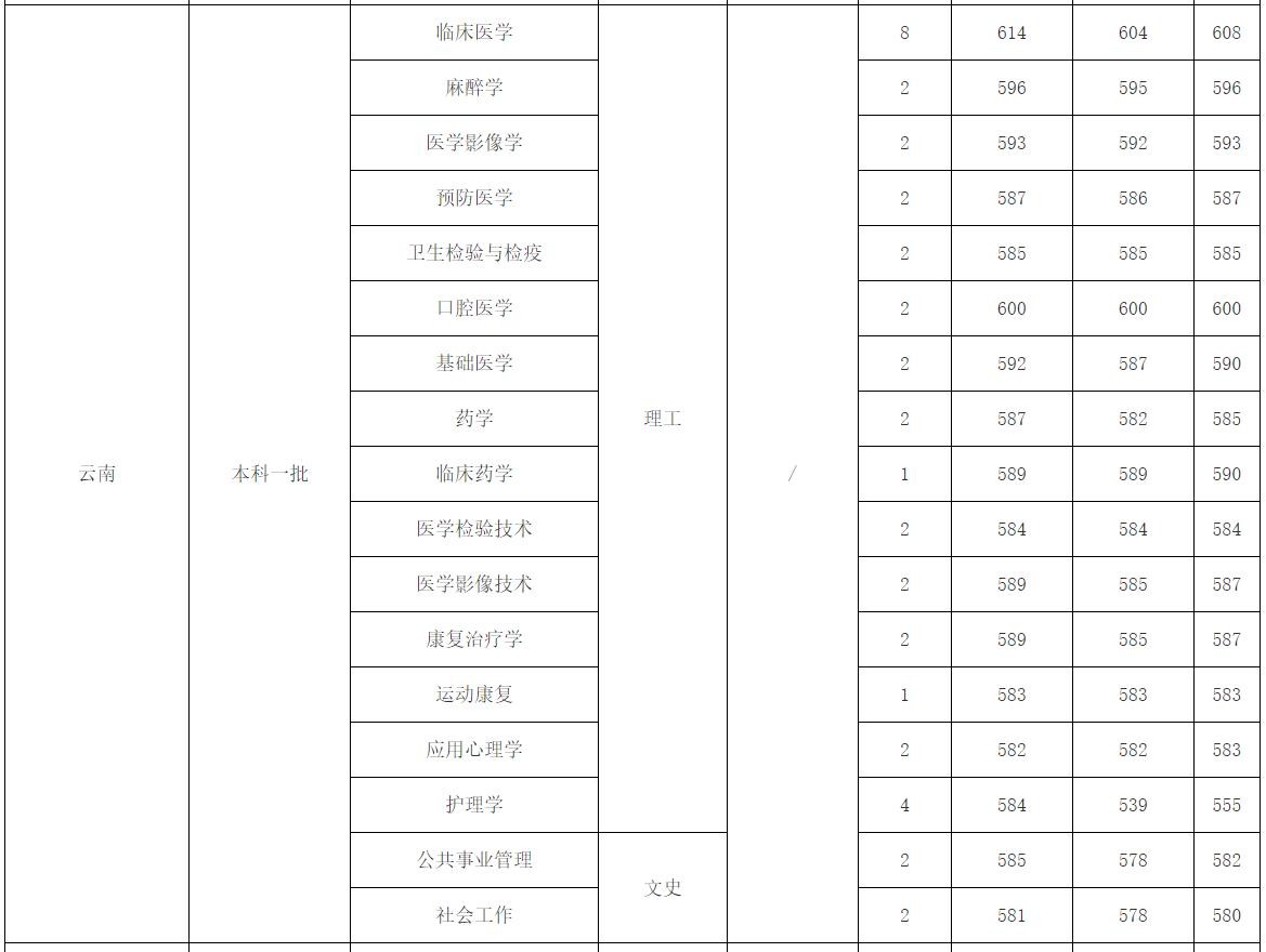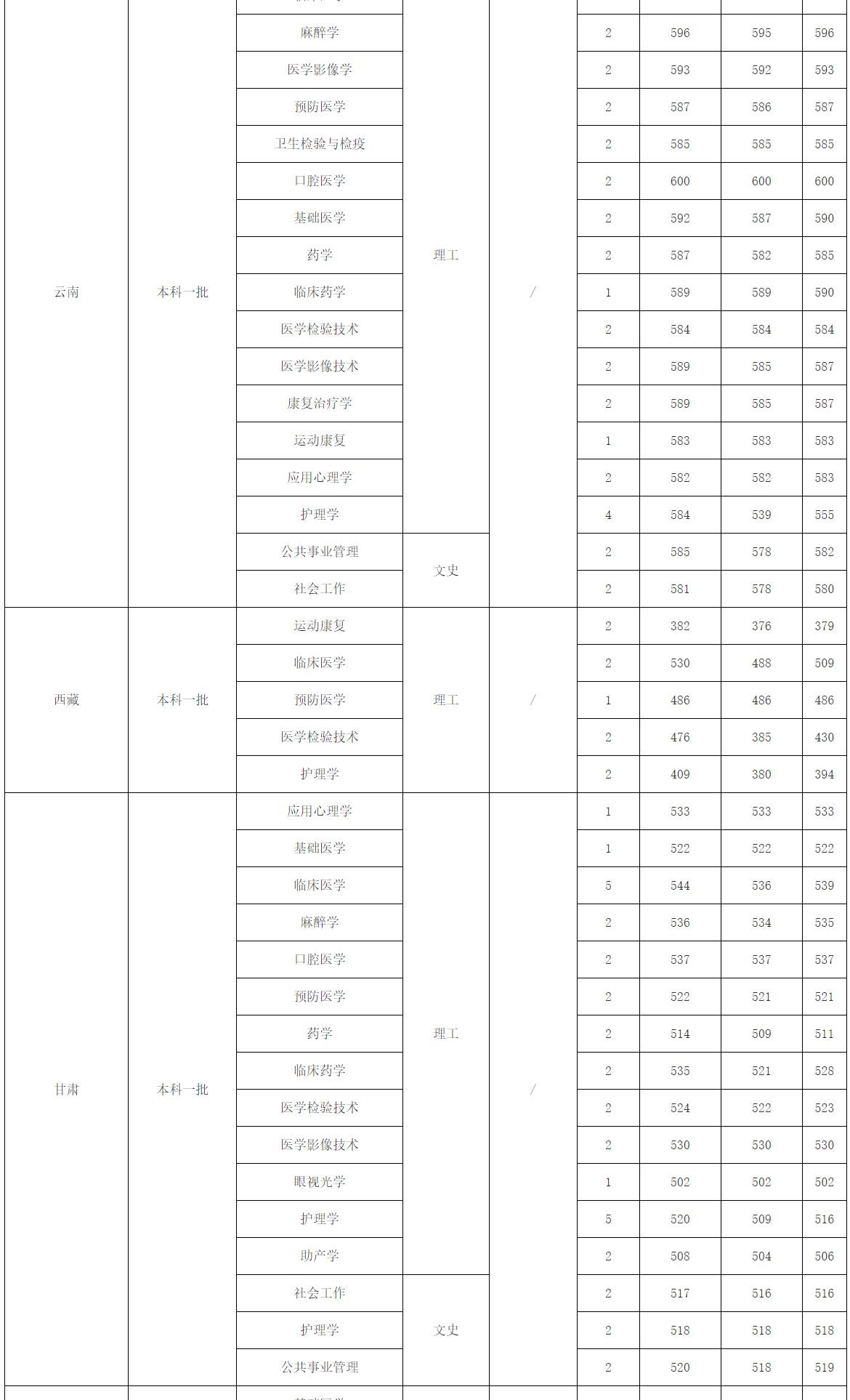 理工类:口腔医学专业的录取分数线最高,录取最低分为590分。护理学专业的录取分数线最低,录取最低分为516分。