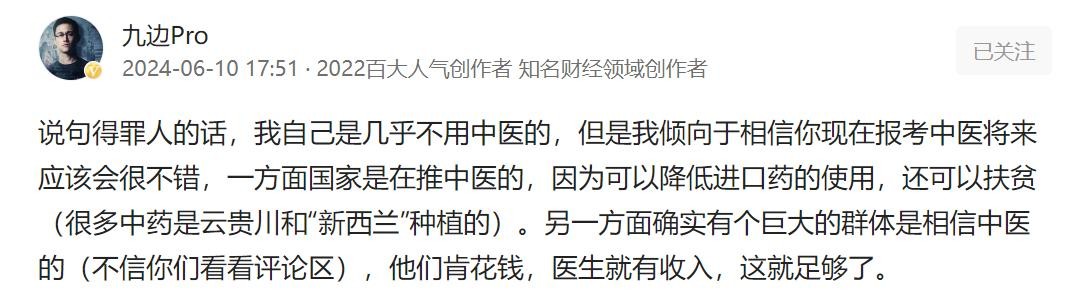 成为大V之后,发表的观点传播更远,就会引来一些牛马蛇神。他们践行的理念就是,挑错和抬杠。例如九边之前提过自己更相信西医,几乎不用中医。结果评论区就吵成了一团,各种负能量聚集在一起,甚至上升到人身攻击,看到这些评论,可能九边也难免郁结吧。