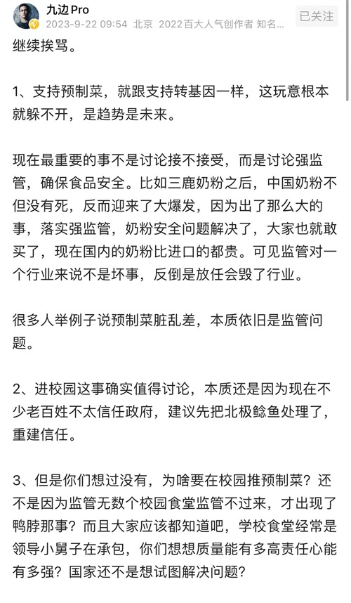 照理来说,九边这样的聪明人不可能不知道自己那样说话的后果,但他还是这么做了。我觉得主要原因还是九边是兼职做自媒体,只是他的副业,他自己有本职工作。更何况这几年的时间,已经足够他变现了,很可能已经财富自由。