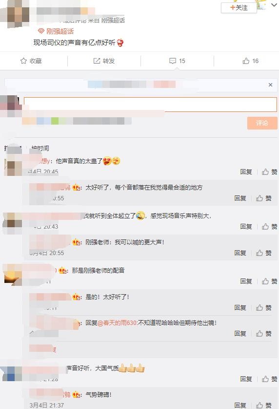 刚强并未出镜许多网友就已经听出了他的声音,浑厚而有力度。虽然是幕后主持,但能到这样的大场合工作,就足以看出央视对刚强能力的肯定。