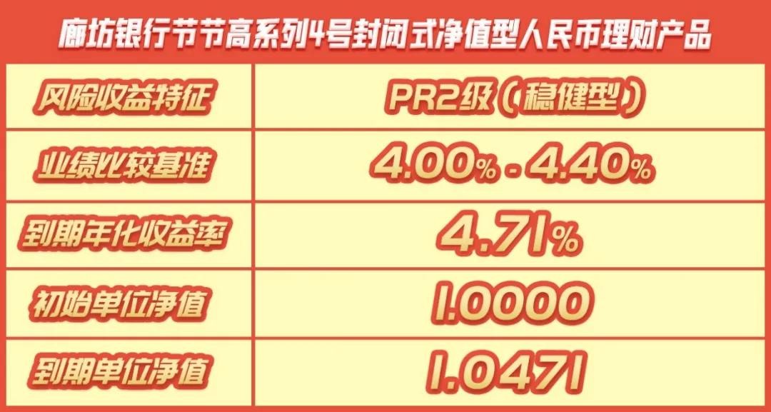 数据来源廊坊银行官网理财信息公告 详情可复制链接至浏览器查看: ccccccc/h444rmlsfye ccccccc/h1ij3tqu4ri >也就是说,如果您购买了10万元的廊坊银行节节高系列4号或5号封闭式净值型理财,按照募集时公布的最低业绩比较基准4.00%,到期后您将会获得4000元收益,而实际上到期后收益率为4.71%,也就是说您实际获得4710元的收益!