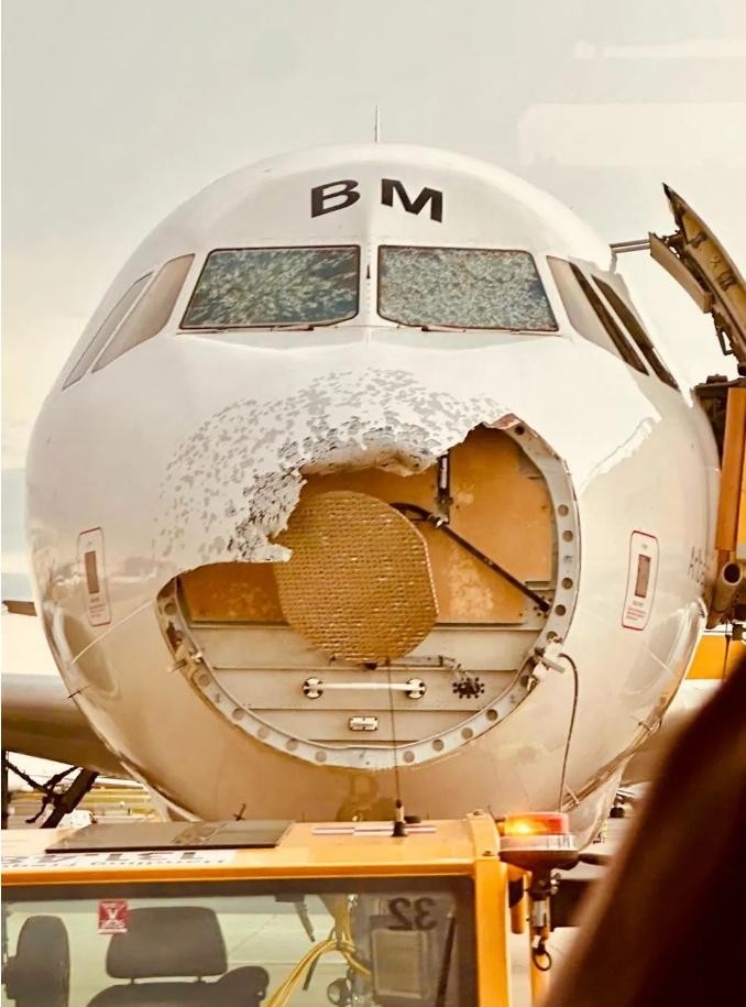飞机驾驶舱的两块挡风玻璃几乎被砸得粉碎,机长的视线受到严重影响,几乎看不清外面的情况。此外,飞机机头的整流罩也破裂开来,部分机身面板也有受损。