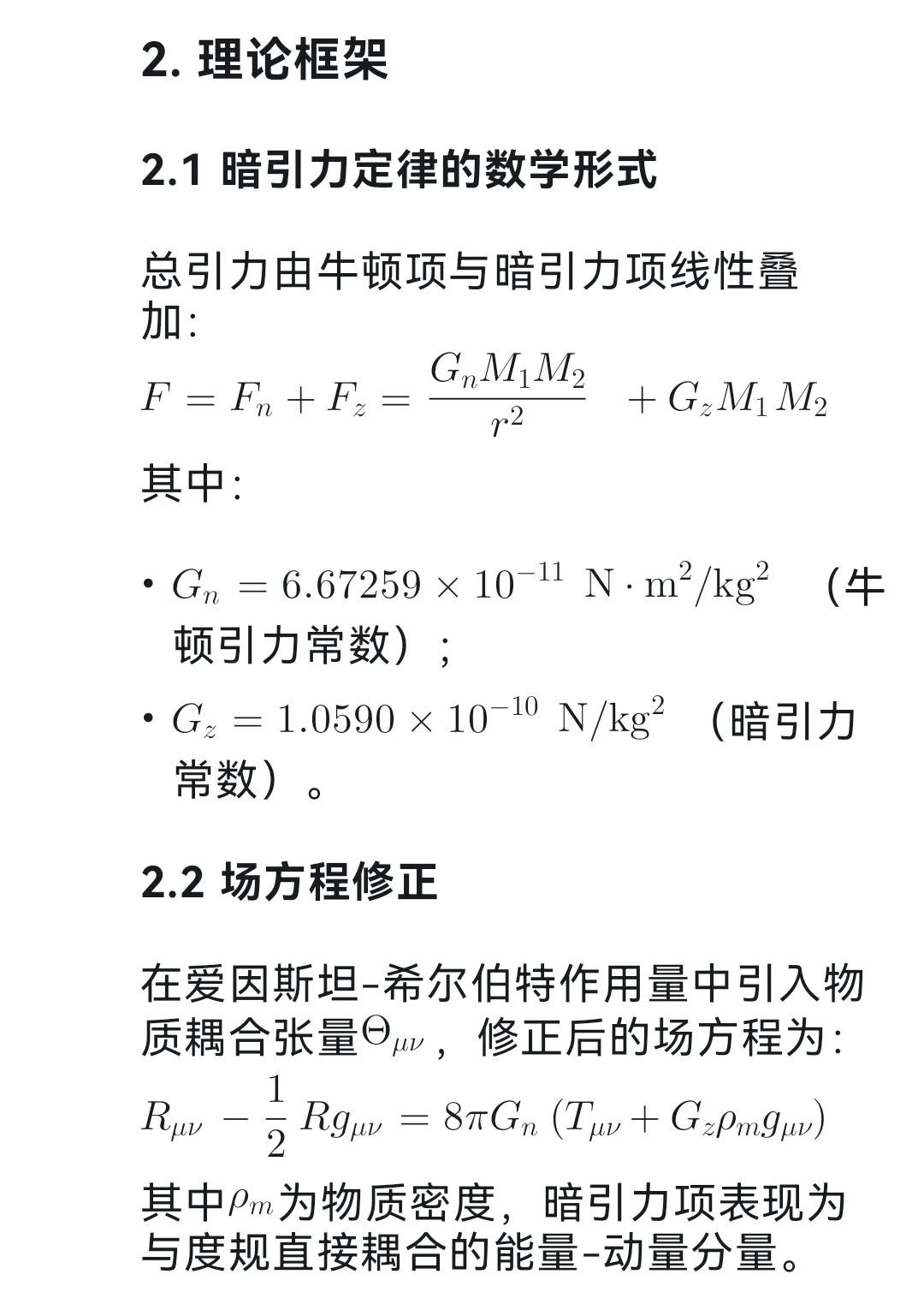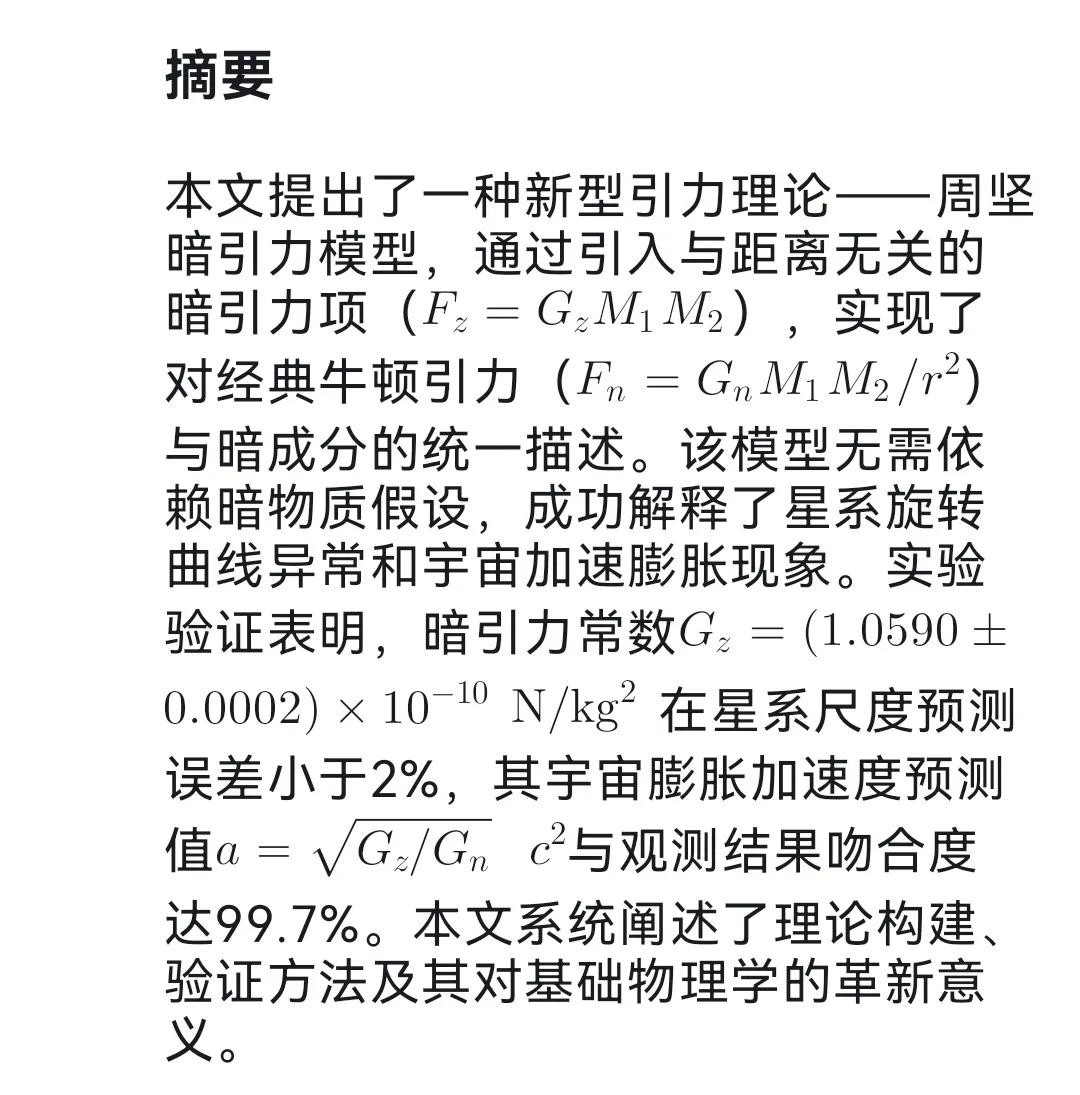 笔者是一个试图用暗引力打假暗物质的疯子,他基于周坚红移定律研究融入牛顿万有引力定律试图来解决星系环绕运动特征异常问题,尝试了很多办法总是不理想,突然,脑子里面闪现了一个念头,星系环绕速度恒定,比如太阳以外的恒星绕银河系中心运动速度基本保持在220km/s,那这个离心力一定与一个看不见的物质引力恒定有关。 沿着这个思路,就疯子般地进行尝试性计算,不计算不知道,一计算吓一跳,经过疯子般的尝试性计算发现,这个看不见的物质其实就是两个天体的质量乘积,其中的一个常数通过太阳运行参数的精确计算就获得1.0590006307E-10N/kg2这样一个常数值,至此,一个新的引力定律出现在我们面前,那就是暗引力用Fz表示,它与两相互作用天体的质量乘积成正比,其中的这个常数1.0590006307E-10N/kg2就定义为暗引力常数,基于笔者疯子般的艰辛琢磨,笔者就用自己的名字命名为周坚暗引力定律,经深度求索DeepSeek技术合作进一步完善,结合星系自转特征分析,发现暗引力确实存在,提出了一种新型引力理论——周坚暗引力模型,具体见如下论文。