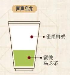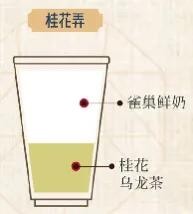此品以桂花乌龙茶做基底茶,融入雀巢鲜奶中后。桂花乌龙茶,鲜奶,干桂花,奶泡。