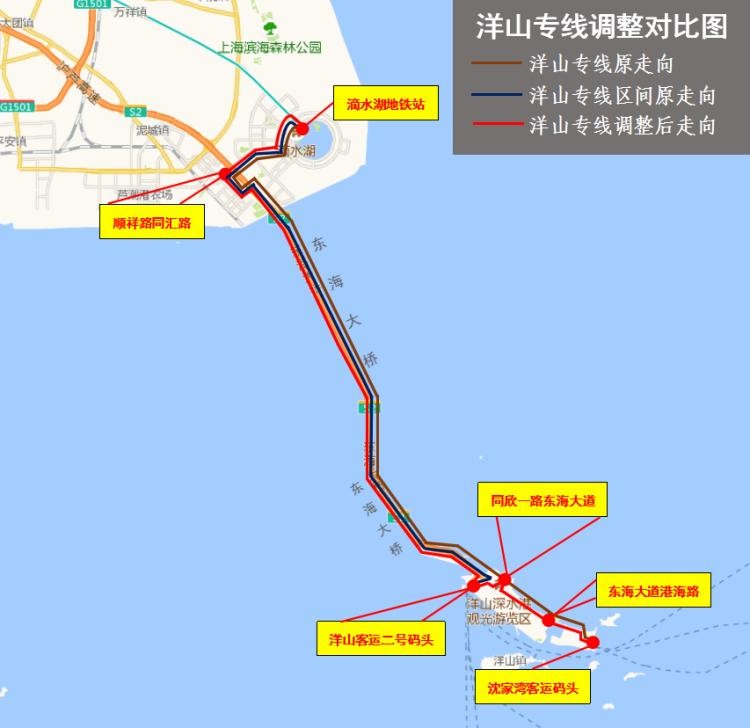 合并调整后,洋山专线走向循原洋山专线全程线,设站6个,分别为:滴水湖地铁站、顺祥路同汇路、洋山客运二号码头、同欣一路东海大道、东海大道港海路、沈家湾客运码头;包含原全程的4个站点外,增加了原区间线的2个站点,一个途经站顺祥路同汇路,一个终点站洋山客运二号码头。