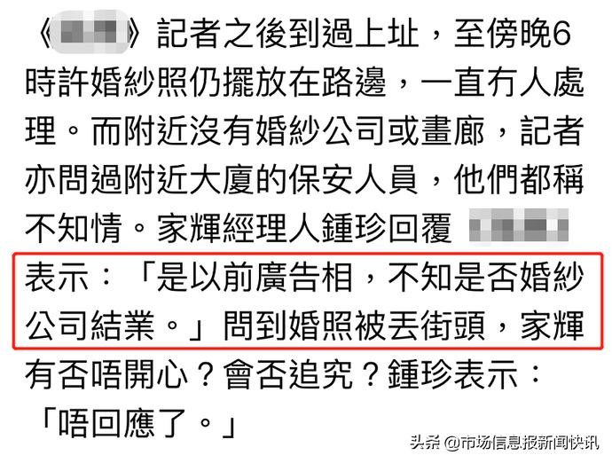 随后有媒体就婚纱照被遗弃一事联系了张家辉经纪人钟珍,钟珍澄清称这是以前拍摄的广告照,张家辉本人并不知情,并表示会和广告公司联系,这样处理张家辉的婚纱照不太妥当。