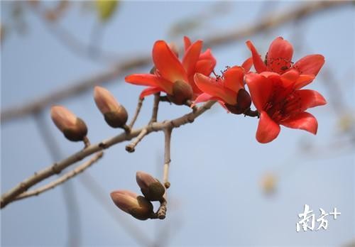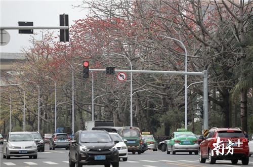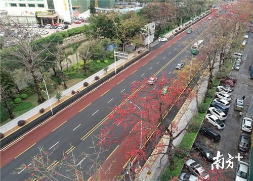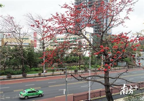 粤海中路的木棉花开得稍迟一些,星星点点的花朵把旁边的建筑点缀得别有一番味道。