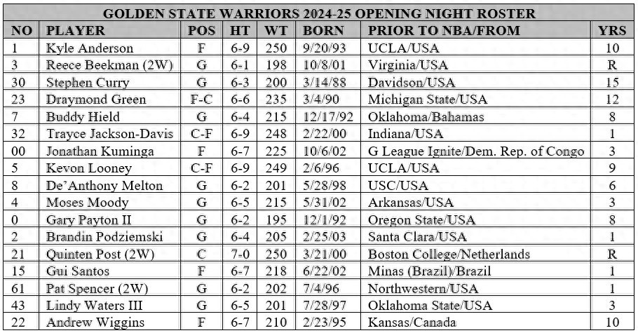 勇士晒新赛季阵容名单:李凯尔113.4公斤最重,36岁库里最年长