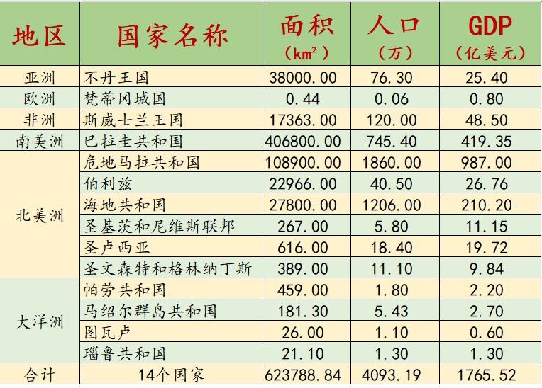 这14个国家总面积约62万平方千米,人口约4000万,除梵蒂冈与巴拉圭外,剩下的大都是在国际上没什么影响力的小国、岛国,或者被其他势力左右的国家。