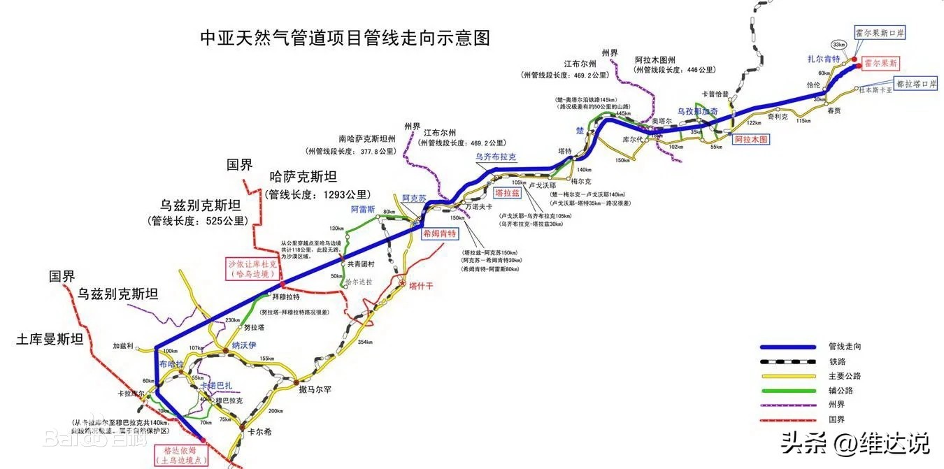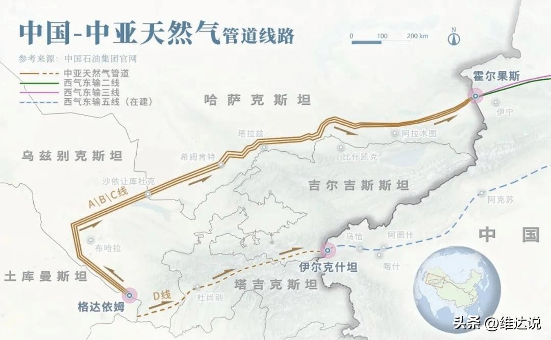 额外一提的是,目前中亚已经有两条油气管道与中国相通,一条是从土库曼斯坦向中国输送天然气的中国-中亚天然气管道,直接衔接中国境内的西气东输二线,总长度超过1万公里,是迄今为止世界上距离最长的天然气大动脉,已累计输送进口天然气4232亿立方米;另外一条从哈萨克斯坦向中国输送石油的中哈原油管道,已累计输送原油超1.3亿吨。