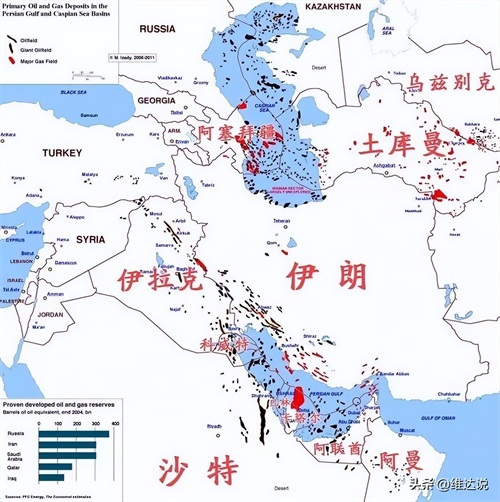 里海被誉为“第二中东波斯湾”,曾占20世纪世界原油总产量的50%。图中黑色为石油带,红色为天然气田