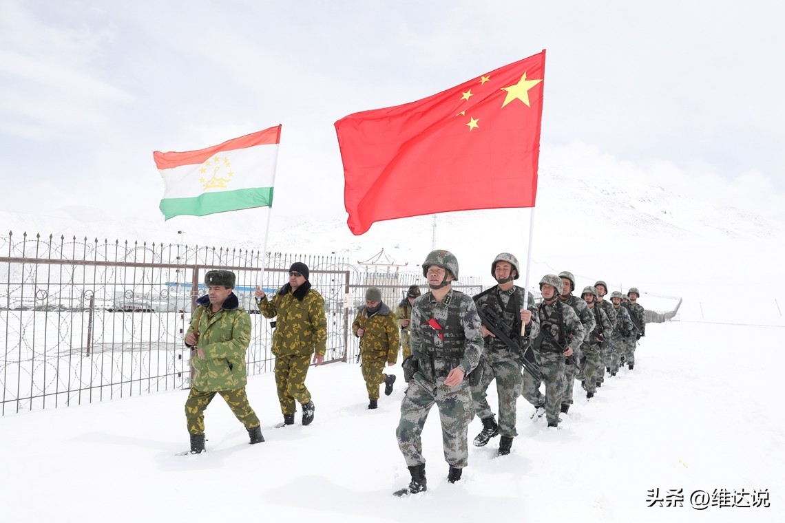 驻守帕米尔高原的新疆军区某边防团官兵和塔吉克斯坦莫尔加布边防总队官兵组成30余人的联合巡逻队共同巡逻