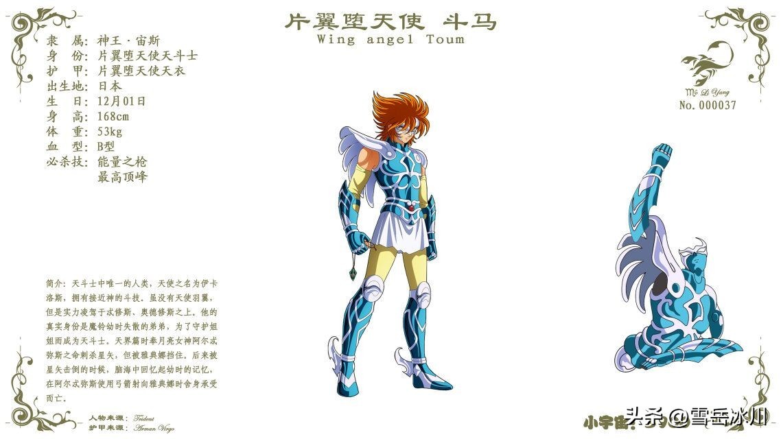 斗马是魔铃失散多年的弟弟,其习得了神之斗技,身穿伊卡洛斯的天衣,是唯一以人类之躯成为天斗士的强者,虽然没有天使羽翼、但这已经是很了不起的事了,而实力方面他却是所有天斗士中垫底的,下图小宇宙3900的数值其实是部分圣迷们编的,官方定位其数值为3600,并且他最终败于单兵作战的星矢就能证明这一点。
