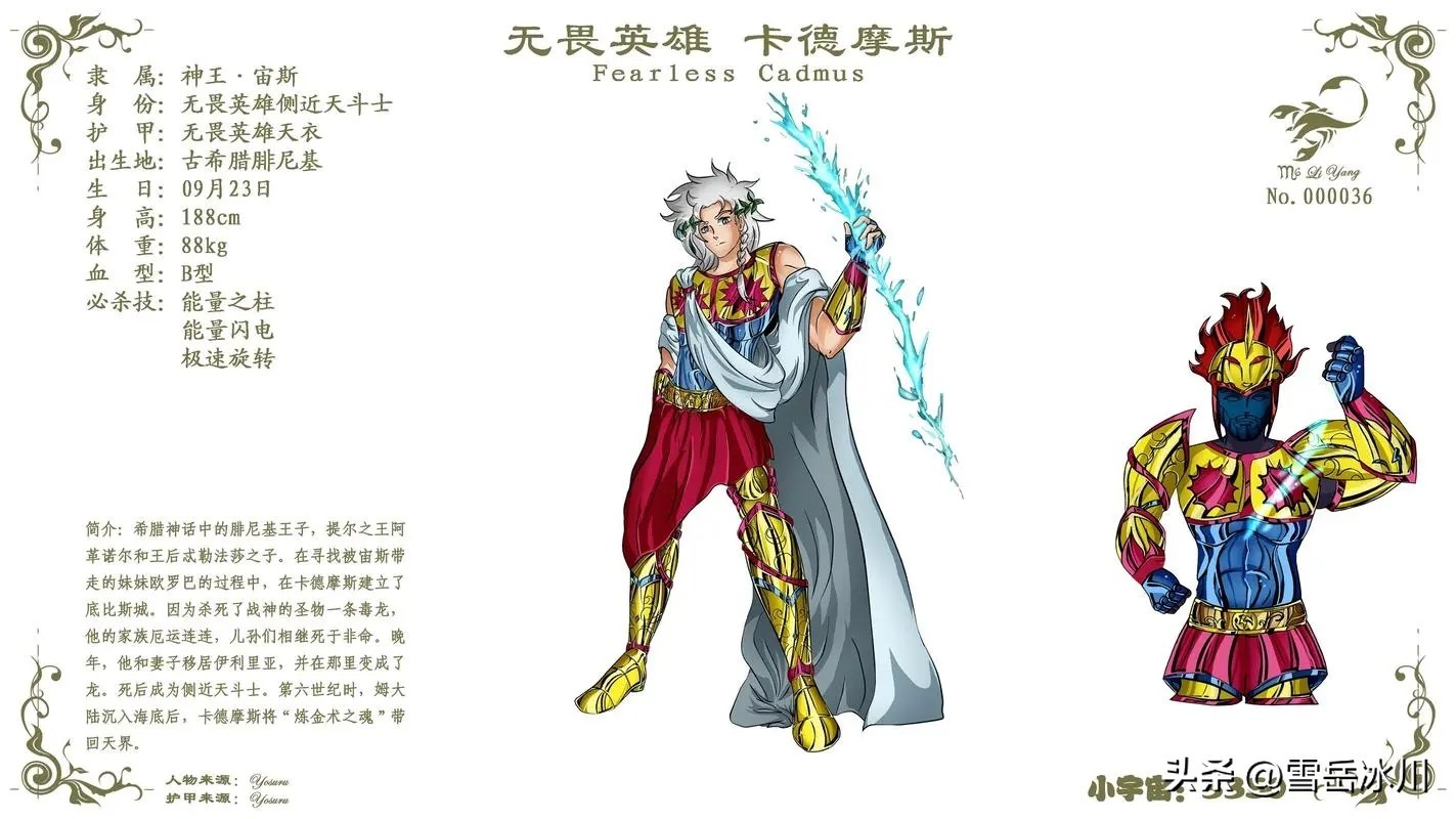 卡德摩斯本来是火神-赫菲斯托斯麾下的顶级战力、七名炎斗士中排第三位,战力数值与俄耳甫斯相当、也是3850,后被宙斯看中招入十八天斗士,火神只能物色了其他人选填补炎斗士的空缺。卡德摩斯不但实力强劲,更是十八位天斗士中唯一能制造和修补天衣的人物,因为在穆大陆沉入海底后,只有他掌握了所谓的“炼金术之魂”并将其带回了天界,天斗士们为了自身的天衣牢不可破,都得给他些面子。