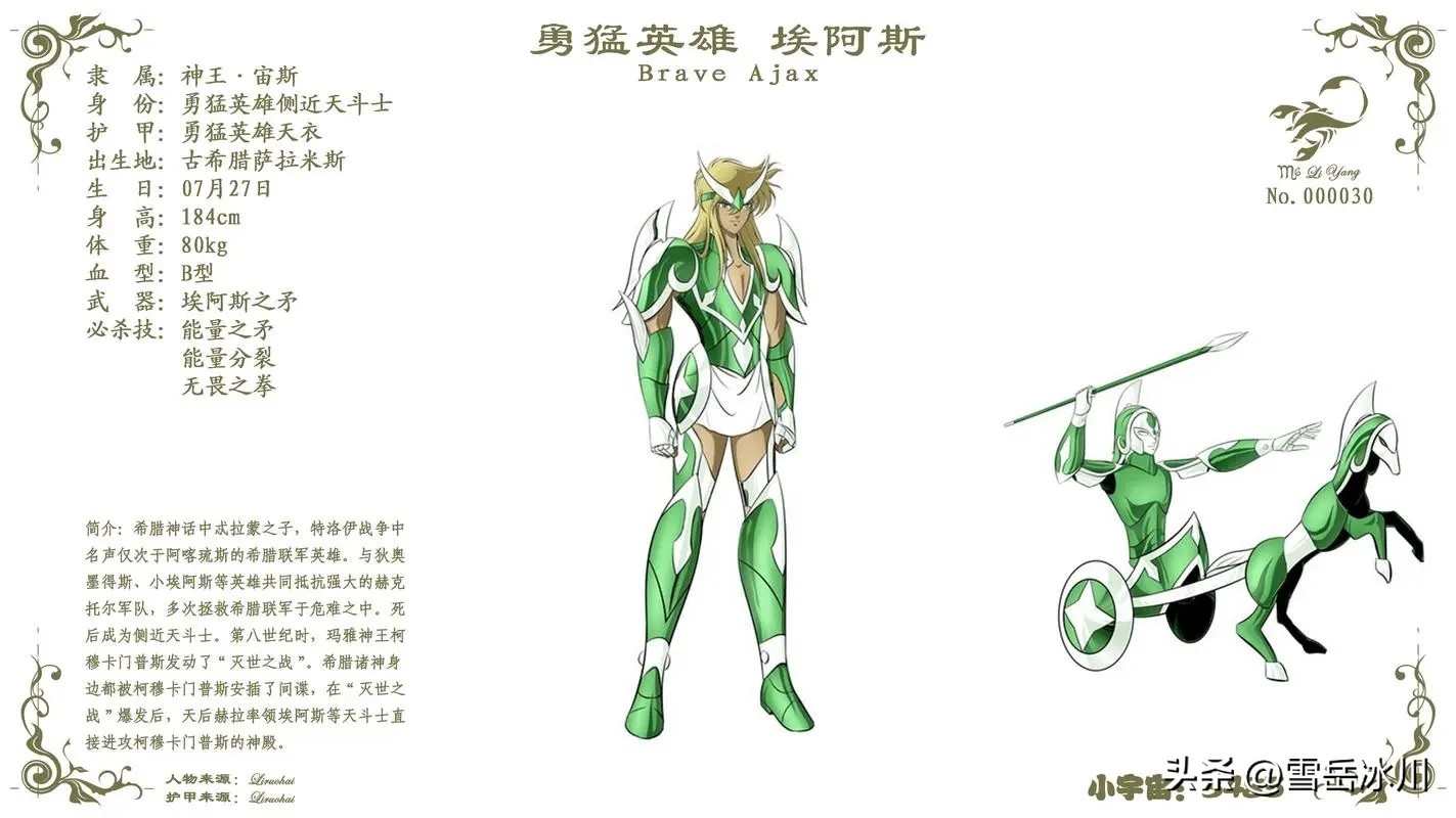 埃阿斯是希腊神话中仅次于阿喀琉斯的英雄,战力数值为3720。成为天斗士后依然勇猛无比,曾攻破过玛雅神王柯穆卡门普斯神殿的大门。他和伊阿宋是好友,所以相当看不起人类身份的天斗士-斗马,只是天斗士之间不能私斗、否则他早就出手替好友报仇了。并且比起斗马他更是想好好教训一下那个所谓能弑神的天马座-星矢,《天界篇序奏》开启后他感到自己教星矢做人的机会或许来了。