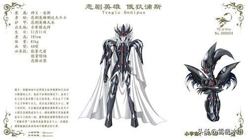 俄狄浦斯的战力数值同样为3950。是圣域与冥界的第五届圣战后、奉神后赫拉之命去制裁圣域的七位天斗士之一。与之对位的是新任双鱼座(上任双鱼已在圣战中牺牲),双鱼座的玫瑰绝技与深红荆棘相继被其绝招:能量侵蚀和能量之盾所破解。最终俄狄浦斯用必杀大招-悲惨世界彻底击败了双鱼座、但并未致死,因为双鱼座舍身的搏命打法也很令他敬佩。