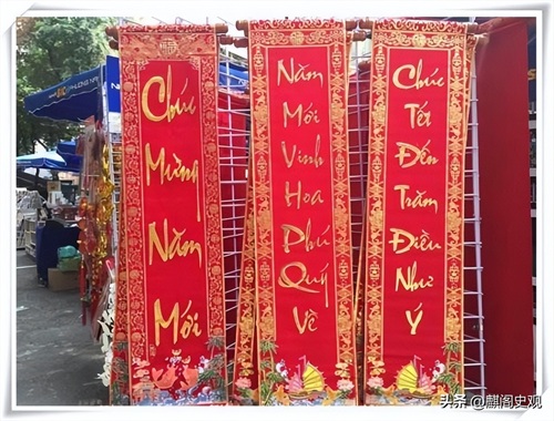 越南也有贴春联的习惯,越南使用汉字接近两千年的历史,早在西汉时期汉字就已经传入越南,以前春联都是用汉字写的,文字拼音化后,他们的的春联大部分采用的都是拼音文字。