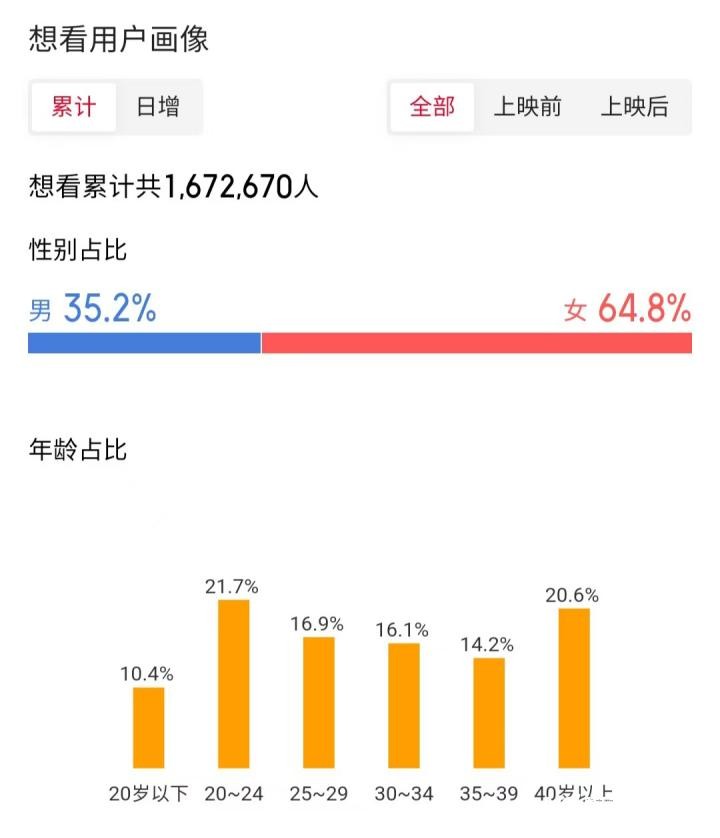 沈建国还观察到,《哪吒2》的观众群体已经远远超出了影院平时的常客范围,很多平时很少进影院的观众也因为这部电影而走进了影院。南都记者通过数据平台的想看用户画像上了解到,观看《哪吒2》的性别占比为:男35.2%、女64.8%,其中20至24岁购票用户达到了最高值21.7%,40岁以上的用户达到了20.6%。
